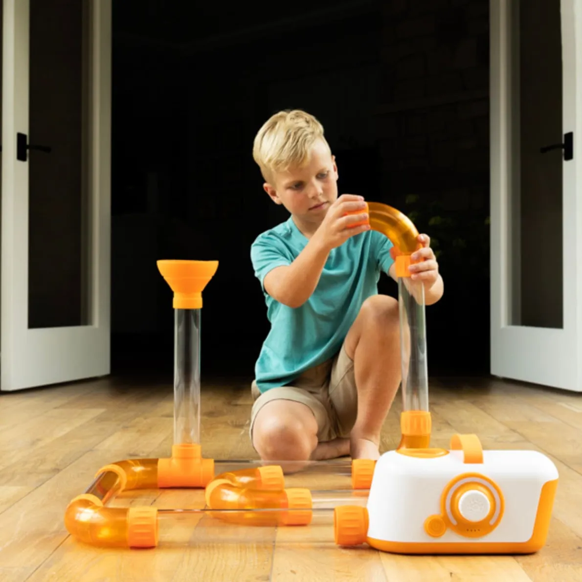 Arrange the tubes and connectors in any way you can imagine. Create loops and swirls. Weave them under tables and over desks. Then, switch on the turbine and let the experimentation begin…