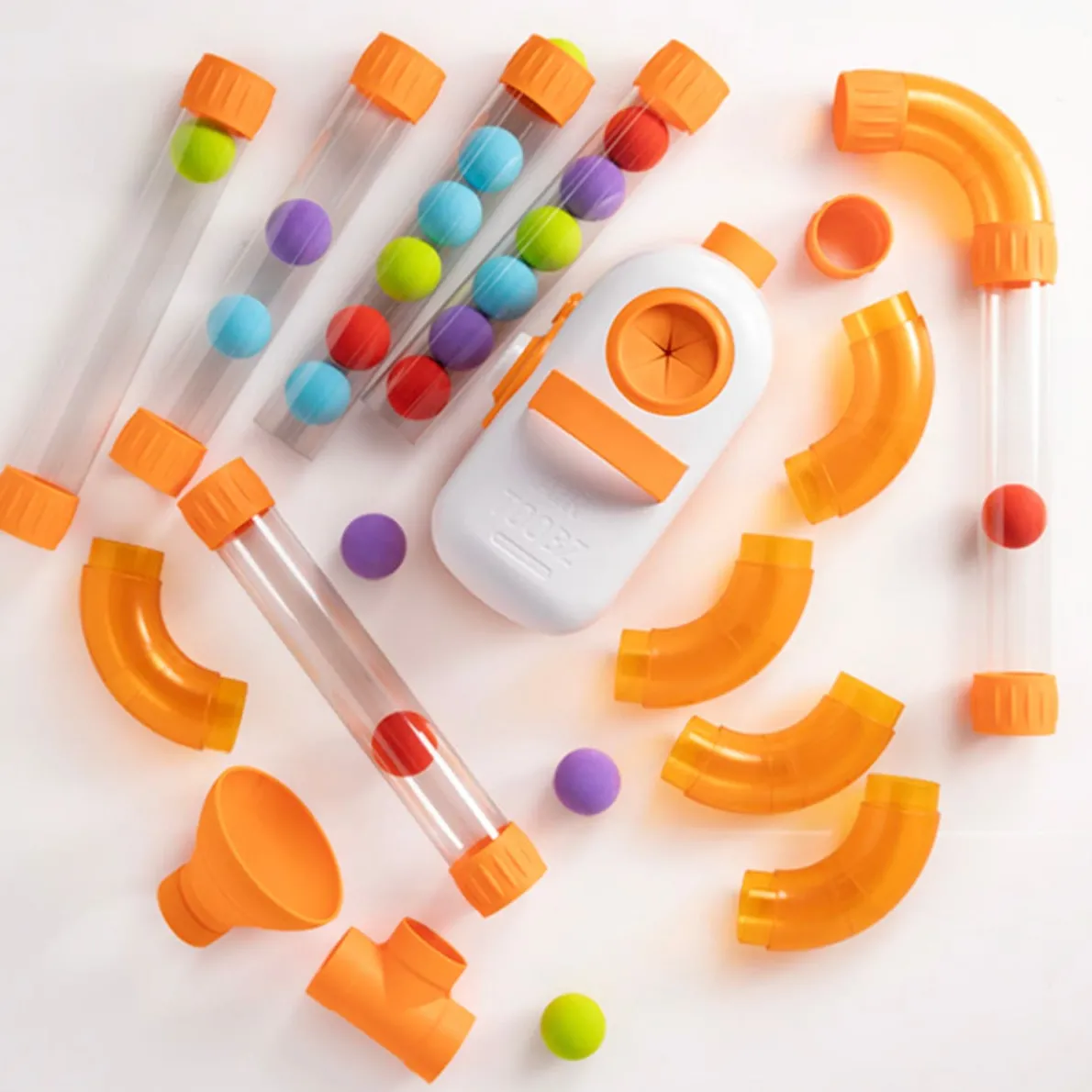- Includes 20 colorful EVA foam balls, 6 transparent 12-inch tubes, 6 transparent orange corner tubes, 1 T-tube, 1 silicone funnel, 12 easy-fit connectors, 1 fan unit, charging cable