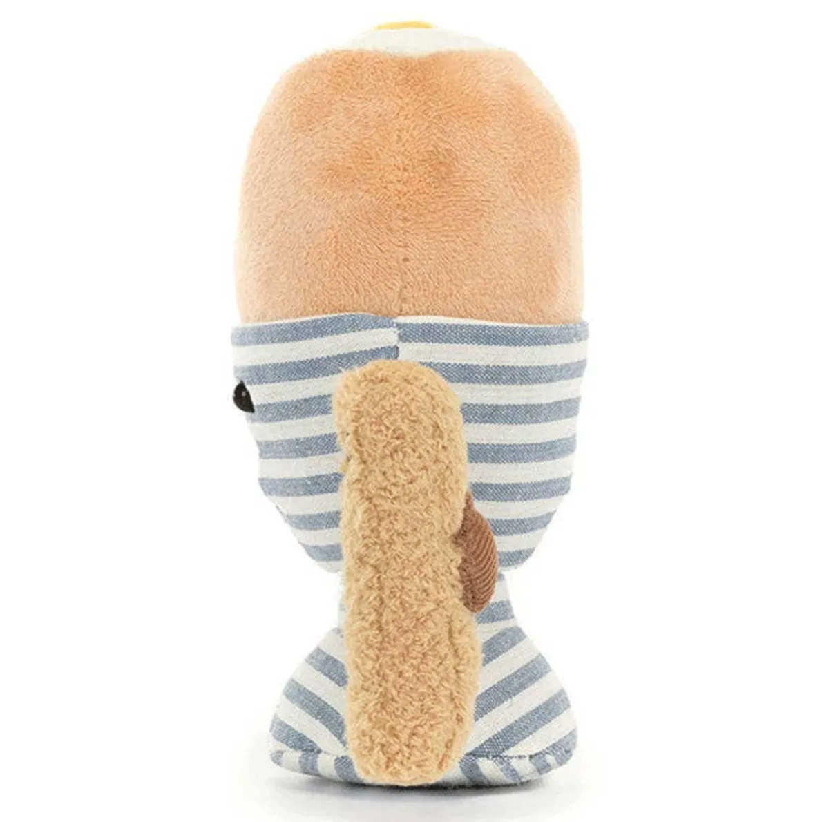 Start every day right with Amuseables Eggetha Egg & Lance Soldier. A textured soft-boiled egg sits in a blue and white striped cotton egg cup with fine cord arms and a stitched smile. Eggetha Egg holds on to perfectly toasted Lance Soldier, in golden brown textured fur with embroidered facial features and mustache.