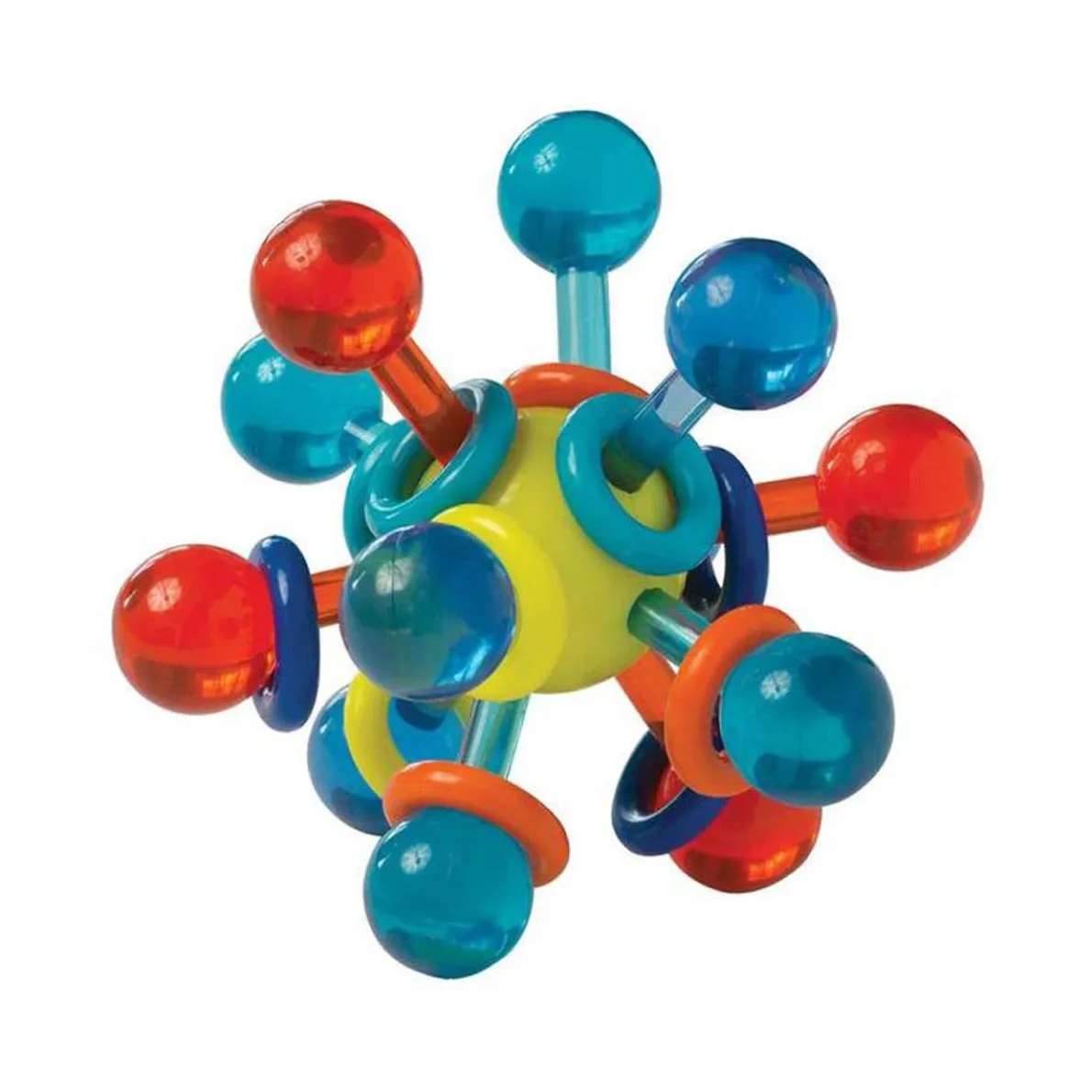 The Atom Teether Toy is out of this world! Twelve bendy arms perfect for teething, surround the colorful plastic ball center. Each arm features vibrantly colored plastic clacking rings that rattle with every shake. Bendy teething arms are made from EVA (Ethylene Vinyl Acetate) and as such does not contain BPA or PVC and meets the CPSC and European requirements for phthalates.