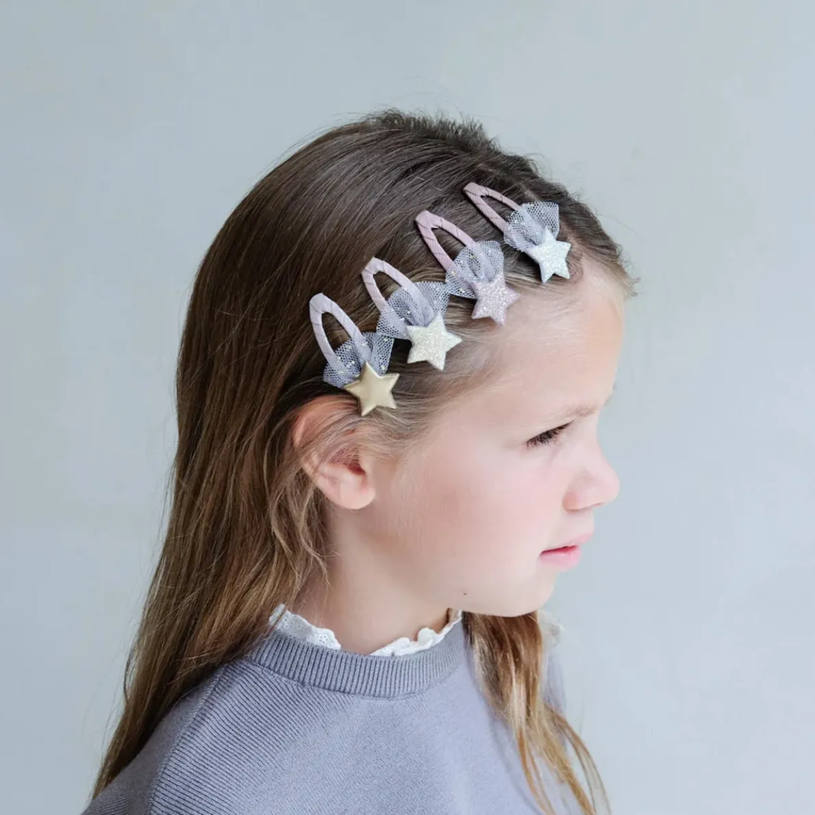 - 5cm soft pink grosgrain ribbon wrapped clic clac clips with metallic and glitter padded fabric stars layered over gold glitter speckled tulle