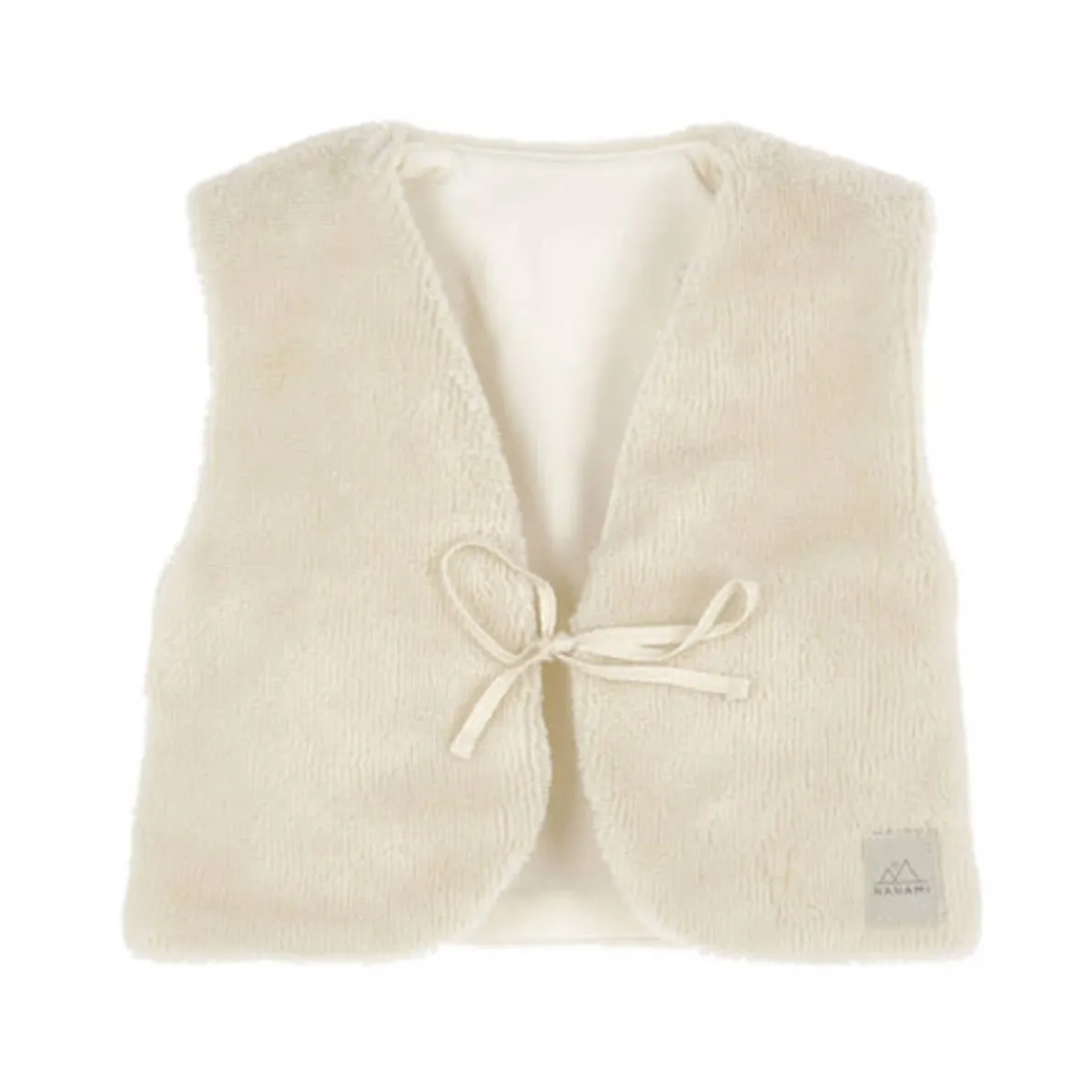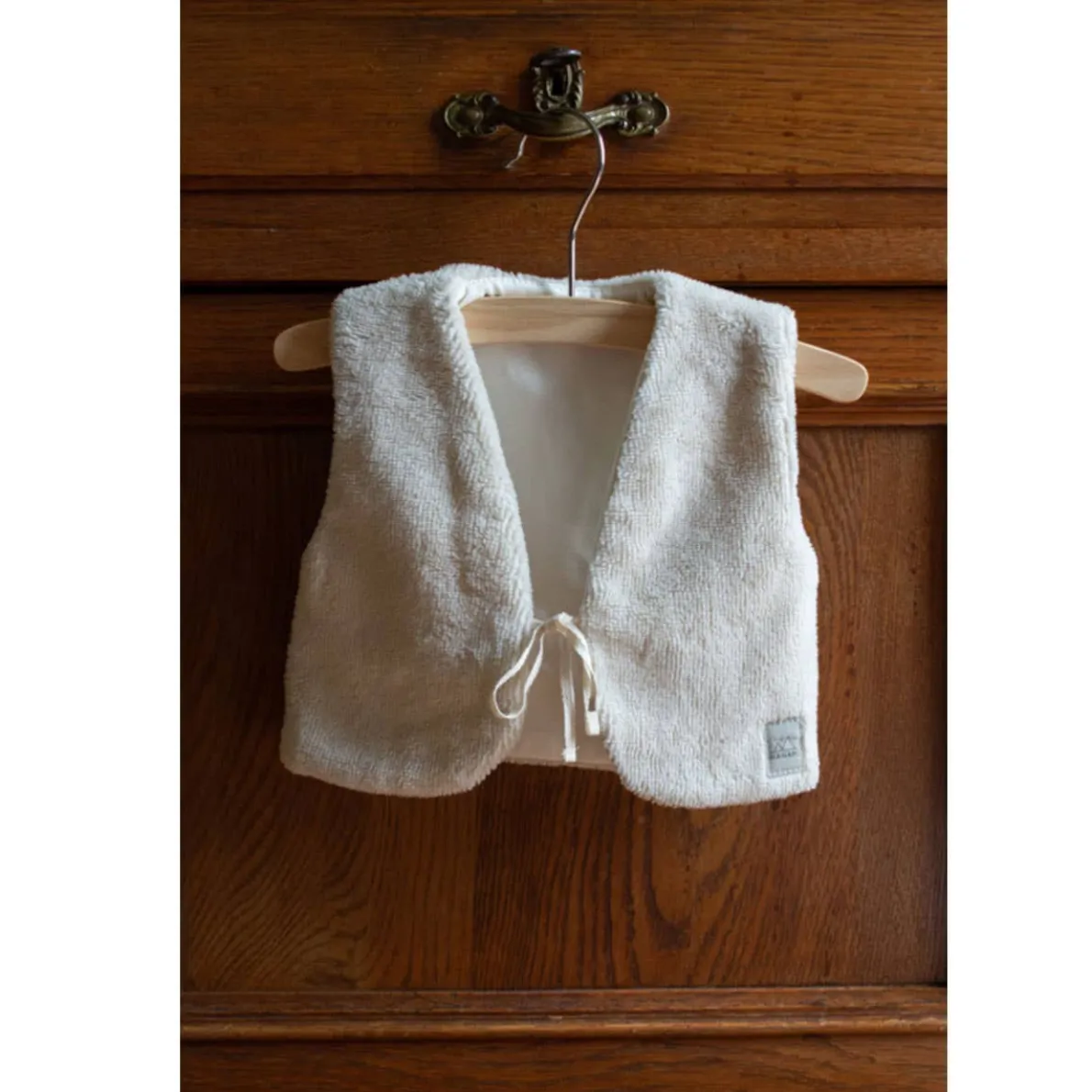 The body warmer is made of bamboo cotton, with 2 cotton ribbons on the front to make it easy to fasten. The body warmer is lined with 100% tricot (gots) in ecru