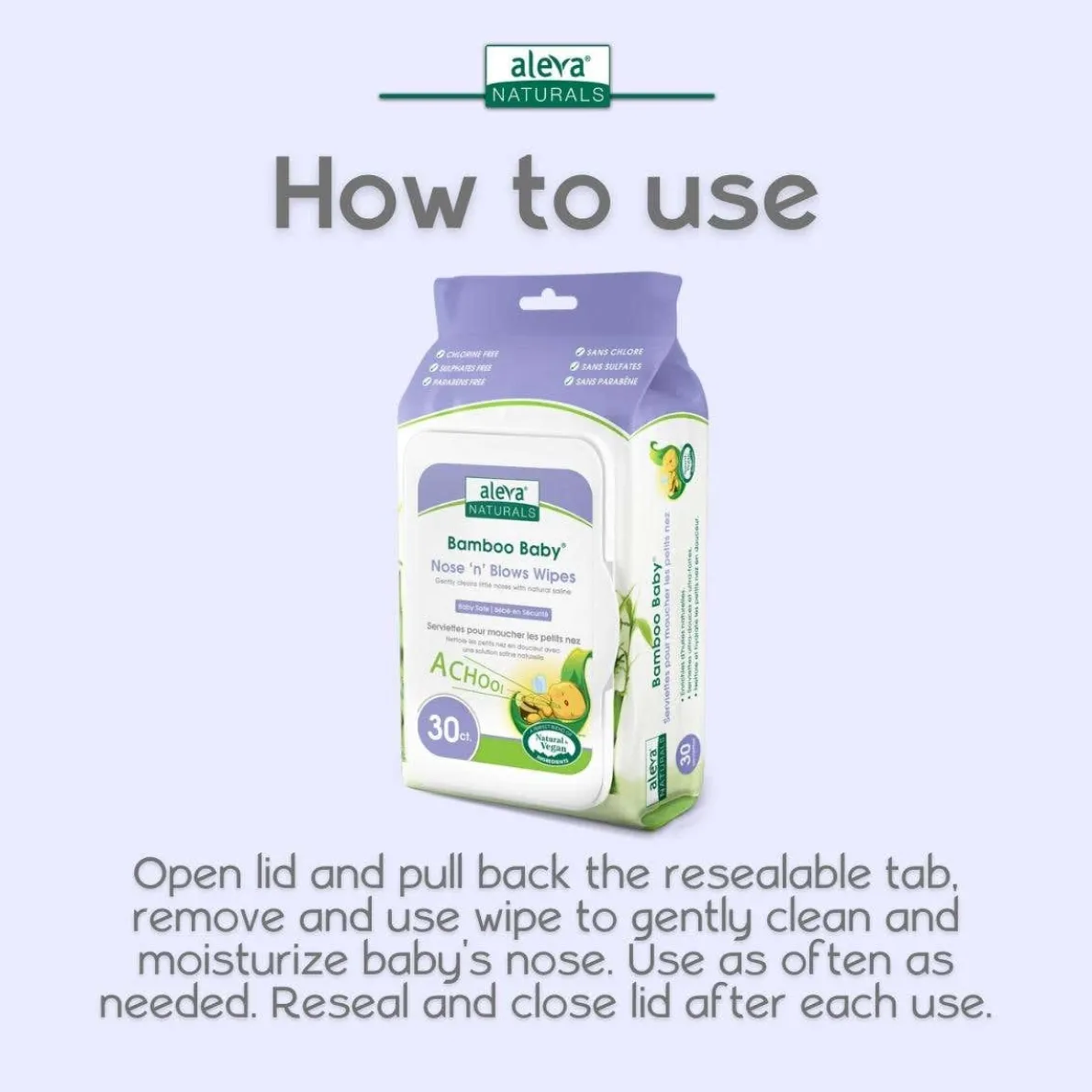 - Use wipes to gently clean and moisturize baby’s nose. Use as often as needed. Reseal and close lid after each use to prevent wipes from drying.