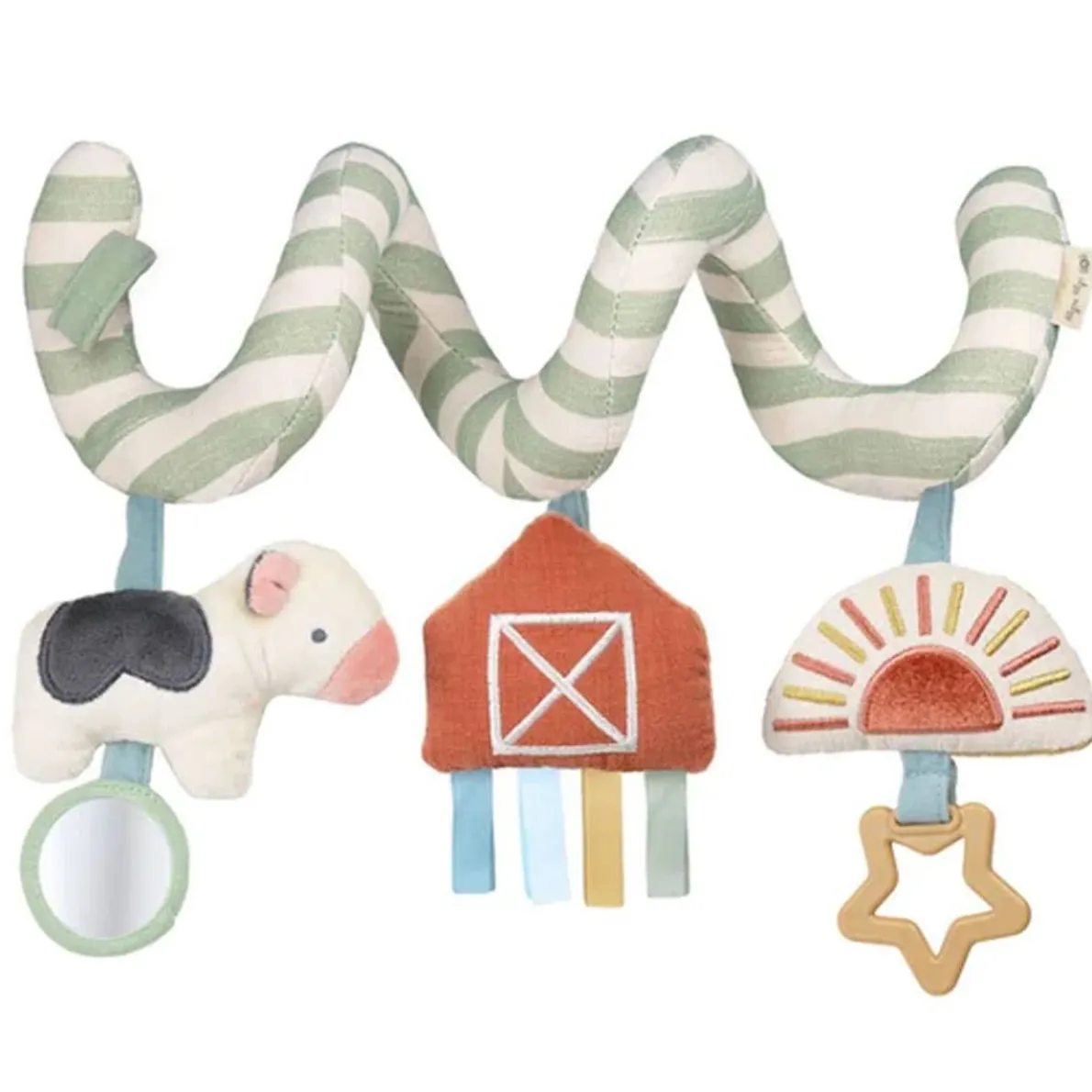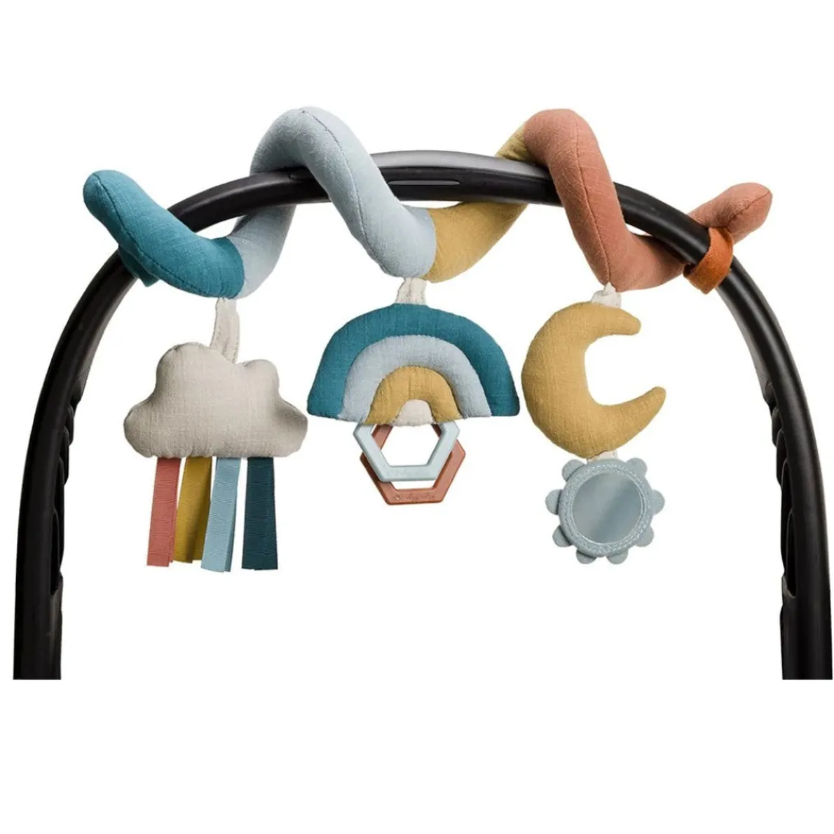 Travels abound! Endless adventures await with your babe’s new travel tagalong, the Itzy Bitzy Spiral Car Seat Activity Toy from our Bitzy Bespoke collection! Watch as your little one reaches for the dangling rainbow rings, smiles at their reflection in the hanging mirror, and grasps for the ribbons and plush moon toy. These interactive hanging toys will keep their little hands busy during car rides, walks and other adventures. Our natural cotton fabrics are gentle and soft to baby’s touch. The flexible spiral design easily and securely attaches to car seat handles or stroller bars for fun on-the-go!