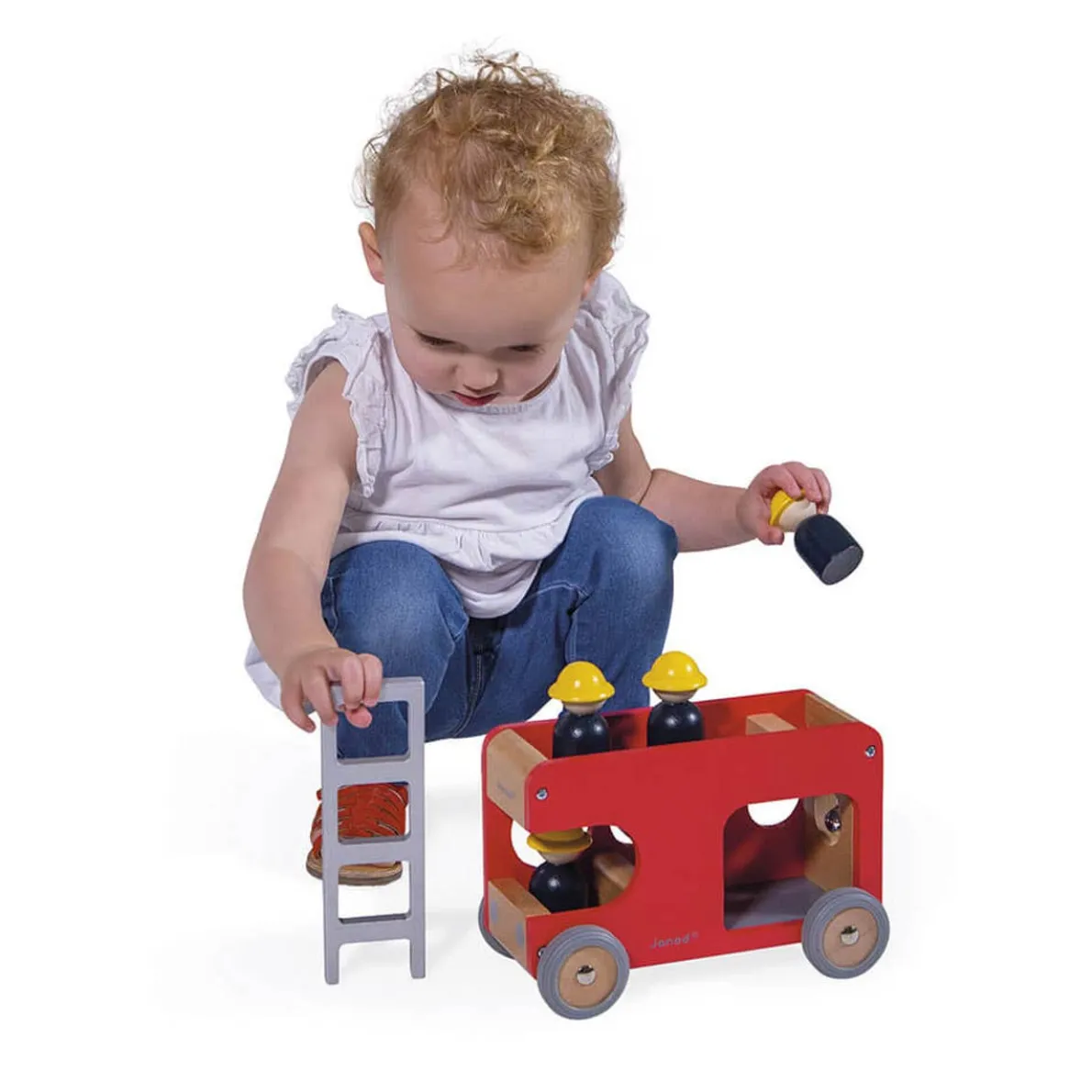 All aboard, we have to go and save a cat stuck in a tree! This large red fire engine made of solid wood is equipped with a bell to signal emergency callouts. Designed for toddlers from 2 years old, this truck comes with 4 firefighters and a removable ladder to allow children to imagine the most incredible stories and create their own universe like the older ones! For ease of use, your child can place the small characters either in the truck or on top with the big ladder. Its large dimensions (22.5 cm long and 15 cm high) and its silent rubber wheels make it a toy perfectly suited to small hands. The littlest children will thus be able to develop their fine motor skills while having fun. Which room will your child have the most fun in with this beautiful toy? This toy is made of FSC®-certified wood and painted with water-based paint.
