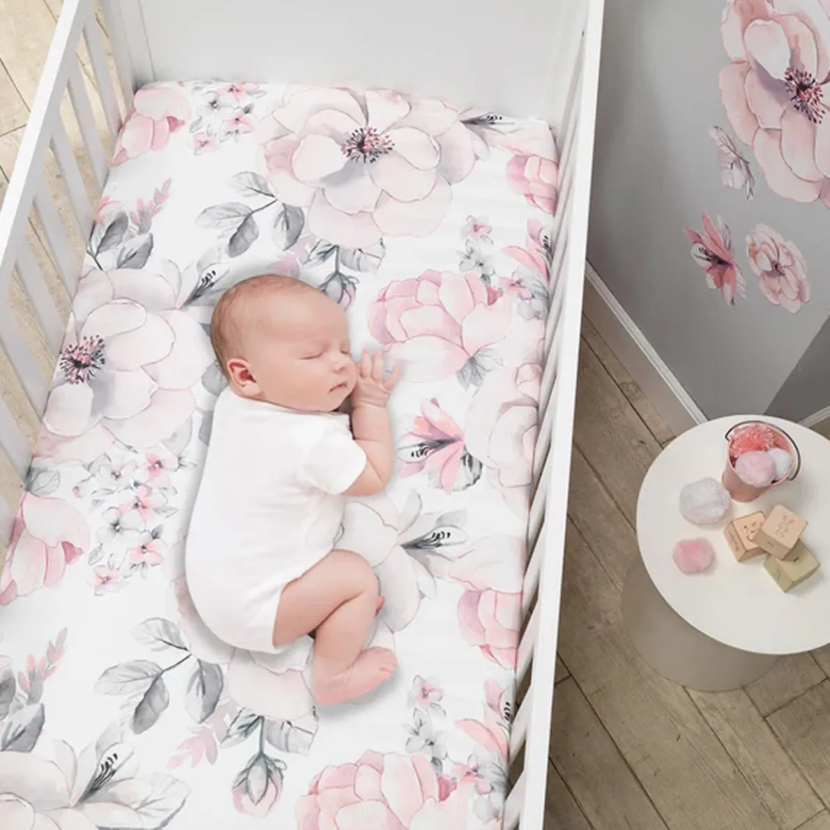 This beautiful reversible floral themed baby bedding nursery set comes complete with a quilt, 100% cotton fitted crib sheet, pom pom trimmed crib skirt and a complete set of wall decals. These gorgeous blossoming flowers are in shades of soft pink with gray accents. It looks like an exquisite watercolor painting and has a border of a linen rayon blend. Pretty pink pom poms decorate the entire quilt and the reverse side is a gray ground with all the pretty coordinating flowers. The 100% cotton fitted crib sheet matches back to the front of this lovely quilt. A 16” long crib skirt in a lovely shade of pink linen and rayon includes the pom pom trim and finishes off the crib in complete luxury. Add to that a set of beautifully toned large wall decals which add a designer touch to the nursery.