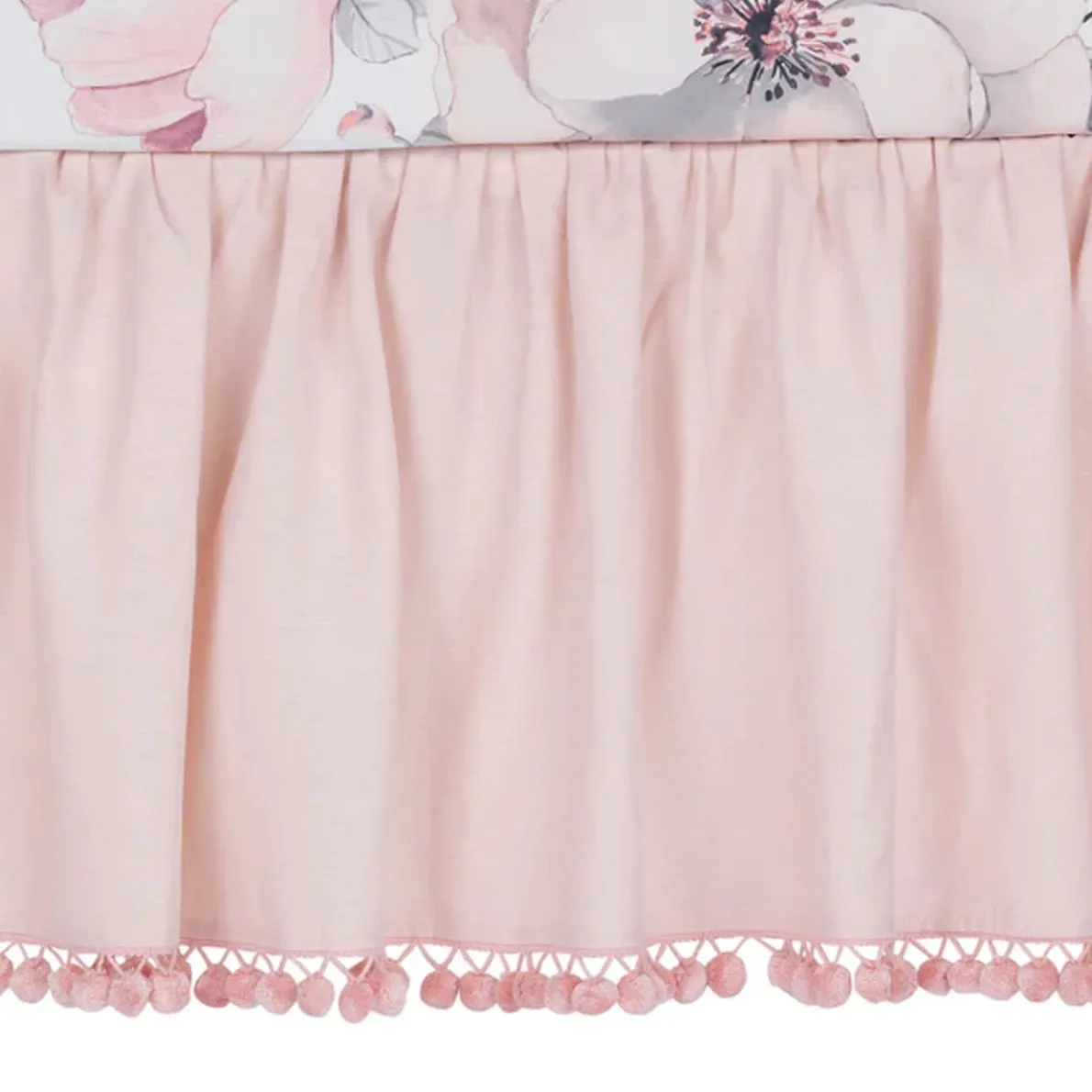 - Stunning shirred 16-inch-long crib skirt with pom-pom trim create a designer look