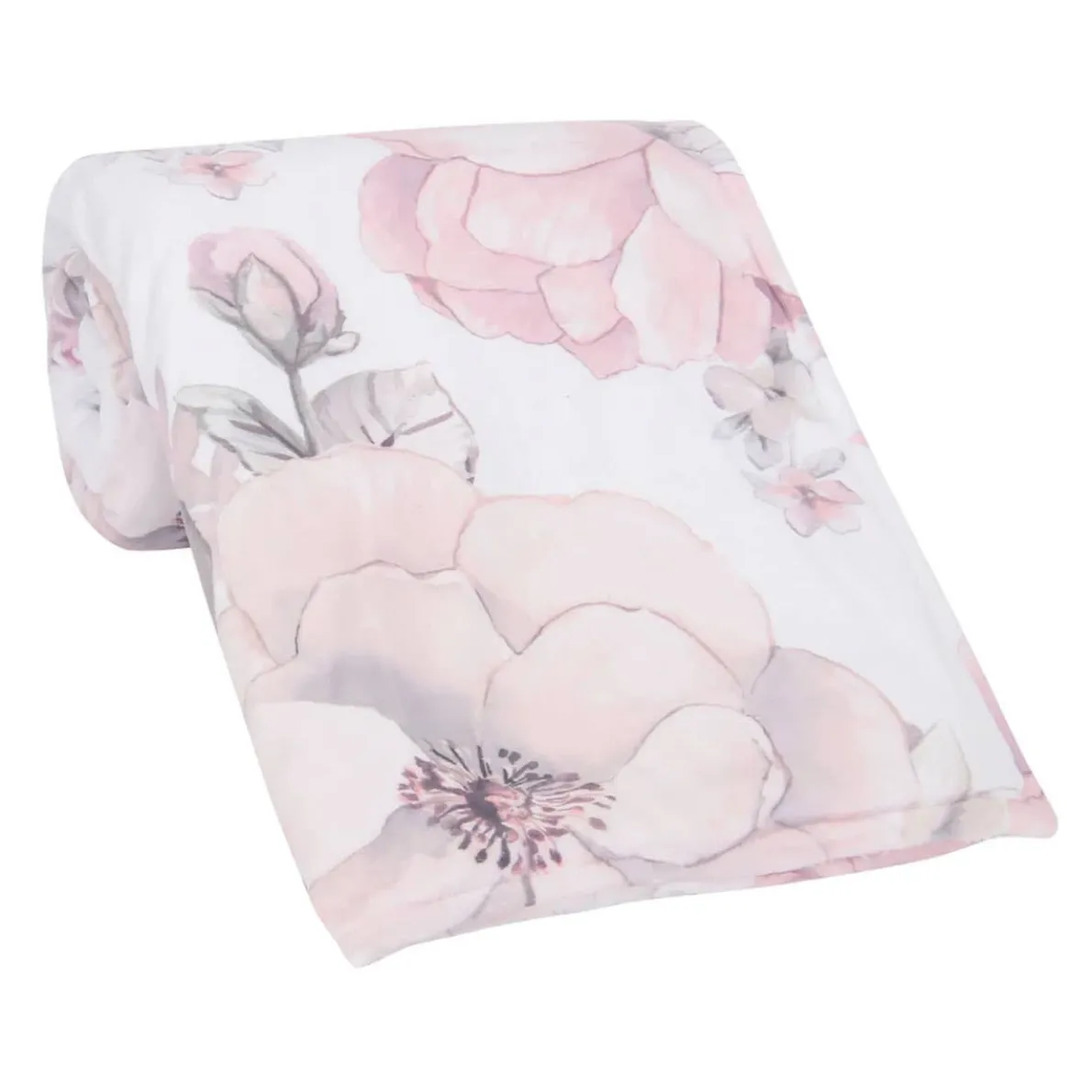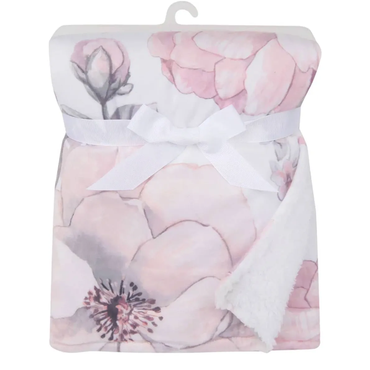This lovely minky front sherpa back fleece baby blanket will wrap your little one in total luxury. Pretty pink and gray watercolor flowers decorate the front, and the back is a soft to the touch white Sherpa. Sized at 30” X 40” it is the perfect stroller blanket. It is ideal for trips to the park, running errands, and is great for moms and little ones on the go. It is machine washable for easy care.