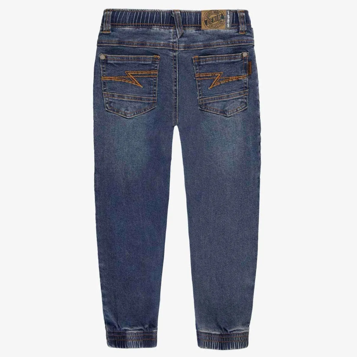 Blue jogger-style jeans for a trendy look. The elastic waistband with an adjustable drawstring ensures maximum comfort. Elastic cuffs and two large front pockets add a stylish touch. Made of stretch denim, your child will be able to move freely.