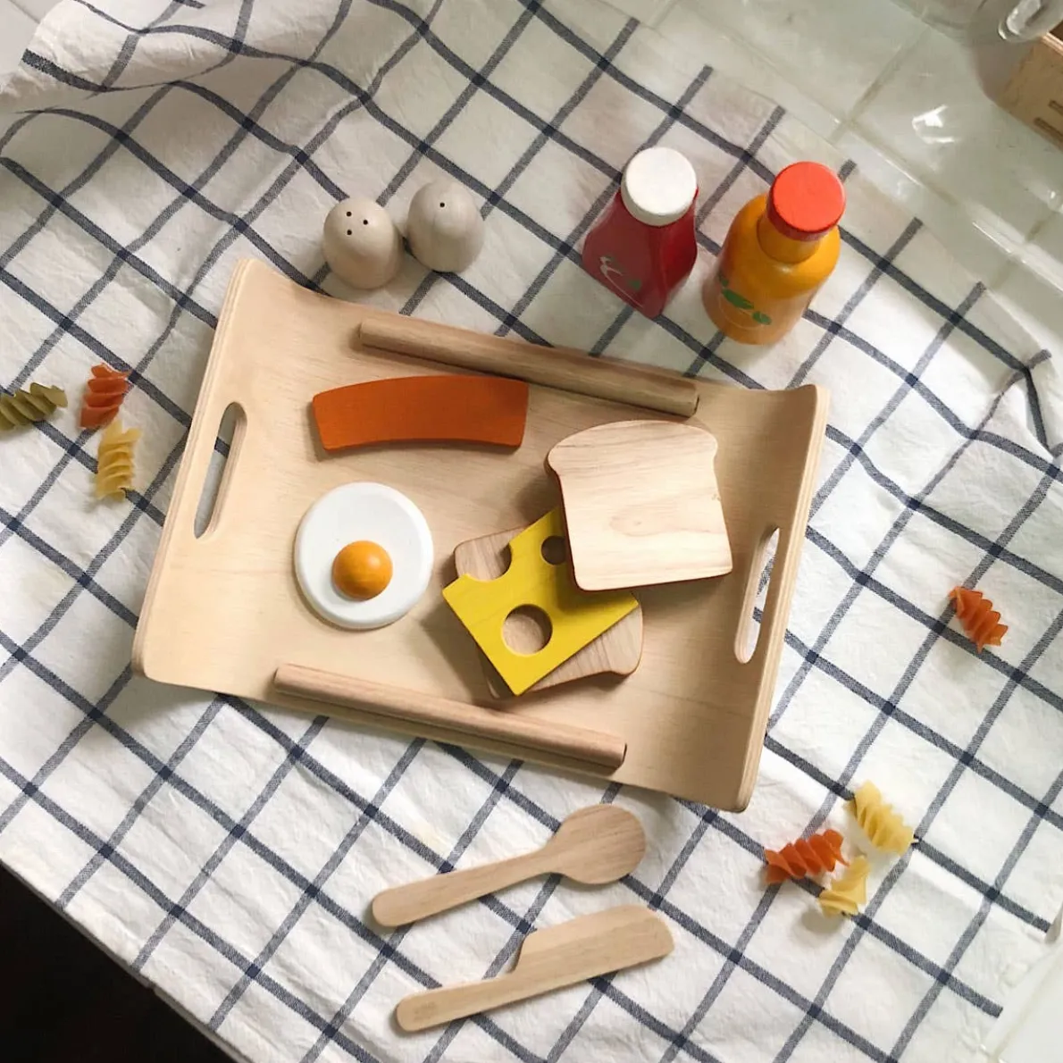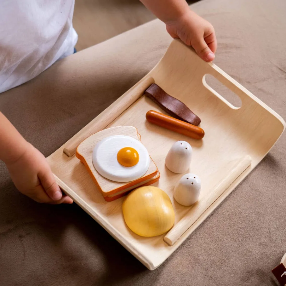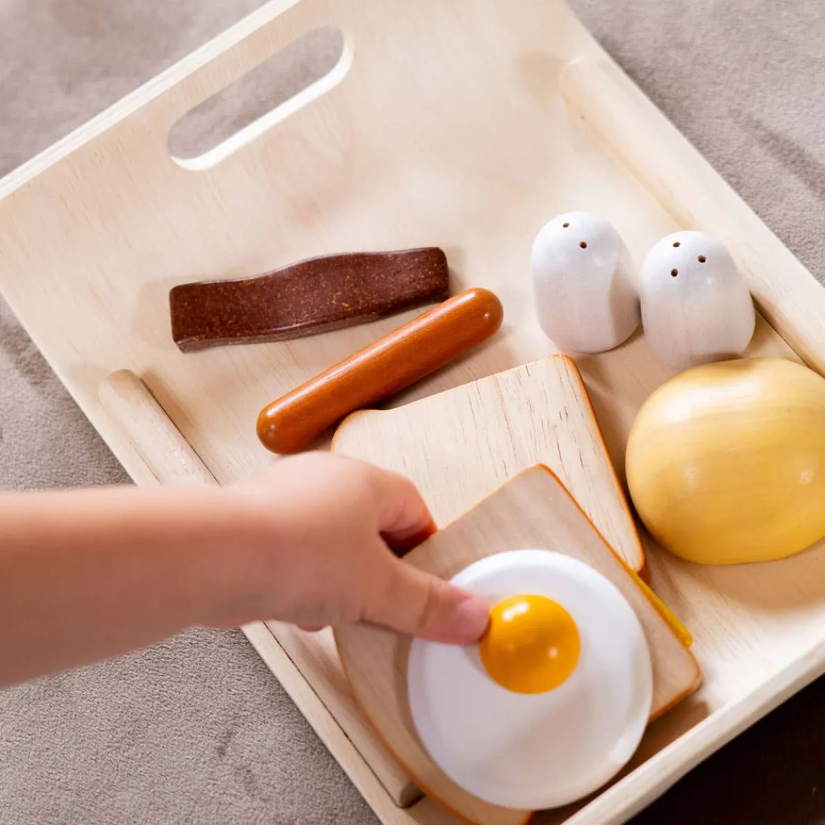 The set includes 2 slices of bread, a bun, sausage, bacon, cheese, fried egg, boiled egg, salt and pepper that are served on a tray.
