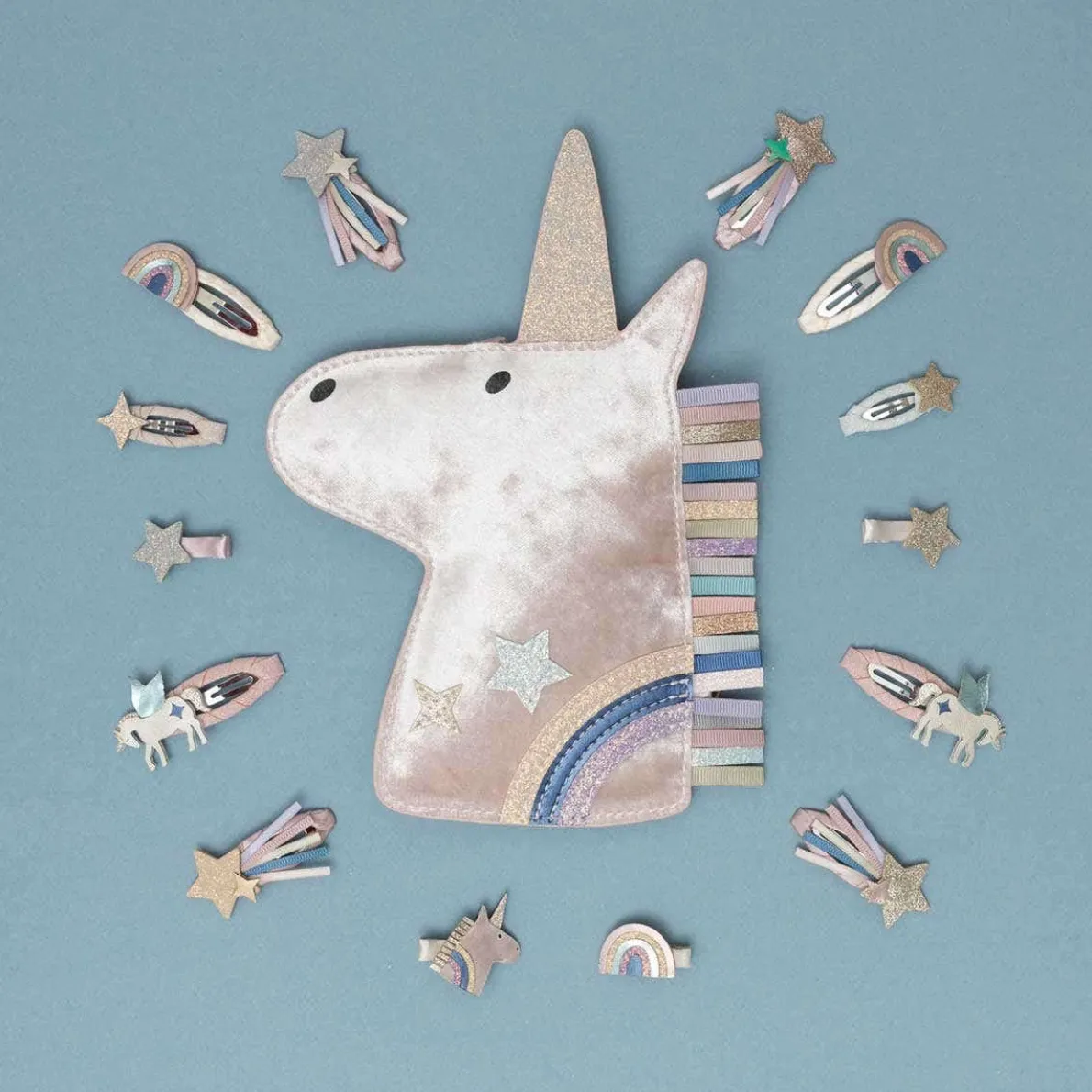 - 3cm ribbon wrapped alligator clips adorned with unicorns, rainbows and stars crafted from a pretty mix of soft velvet, glitter and metallic fabrics
