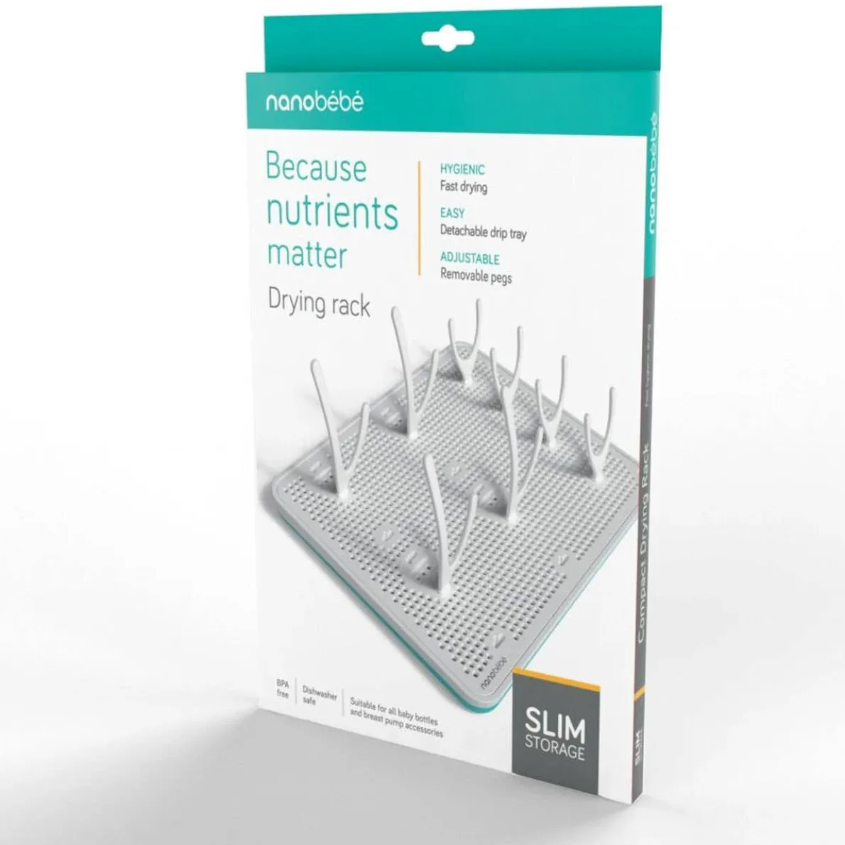 Nanobébé’s slim drying rack is designed for fast and hygienic drying and is both practical and beautiful. Two peg heights accommodate all bottle and accessory sizes. The pegs are removable, so you can arrange them in whichever way suits your drying needs. Nanobébé’s compact drying rack features a detachable drip tray to collect excess water. When drying is done, remove the pegs and store your drying rack flat for ultimate convenience.
