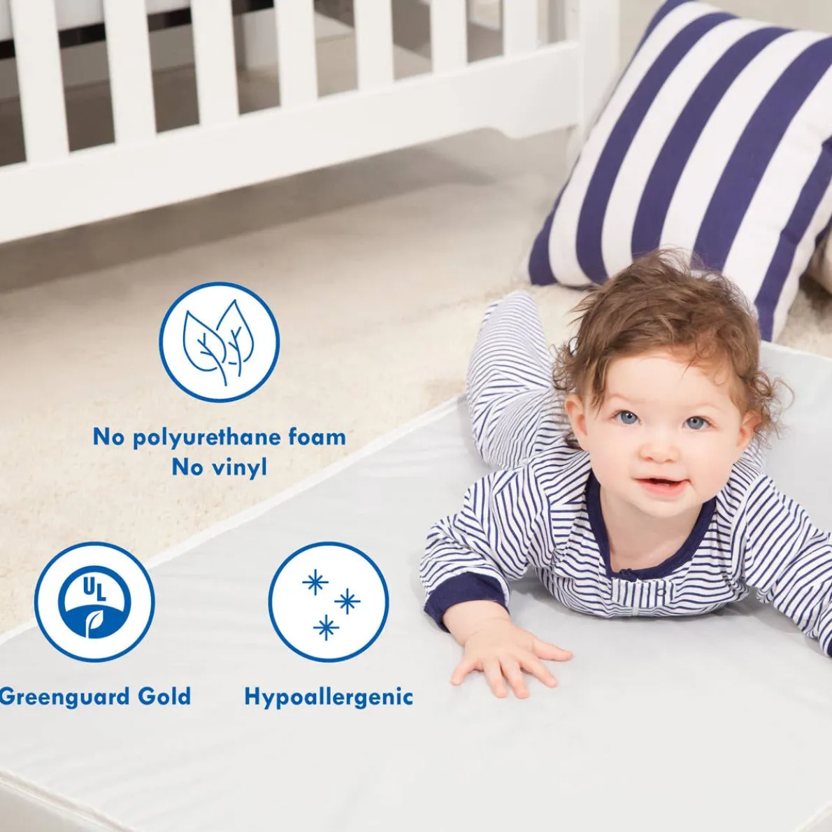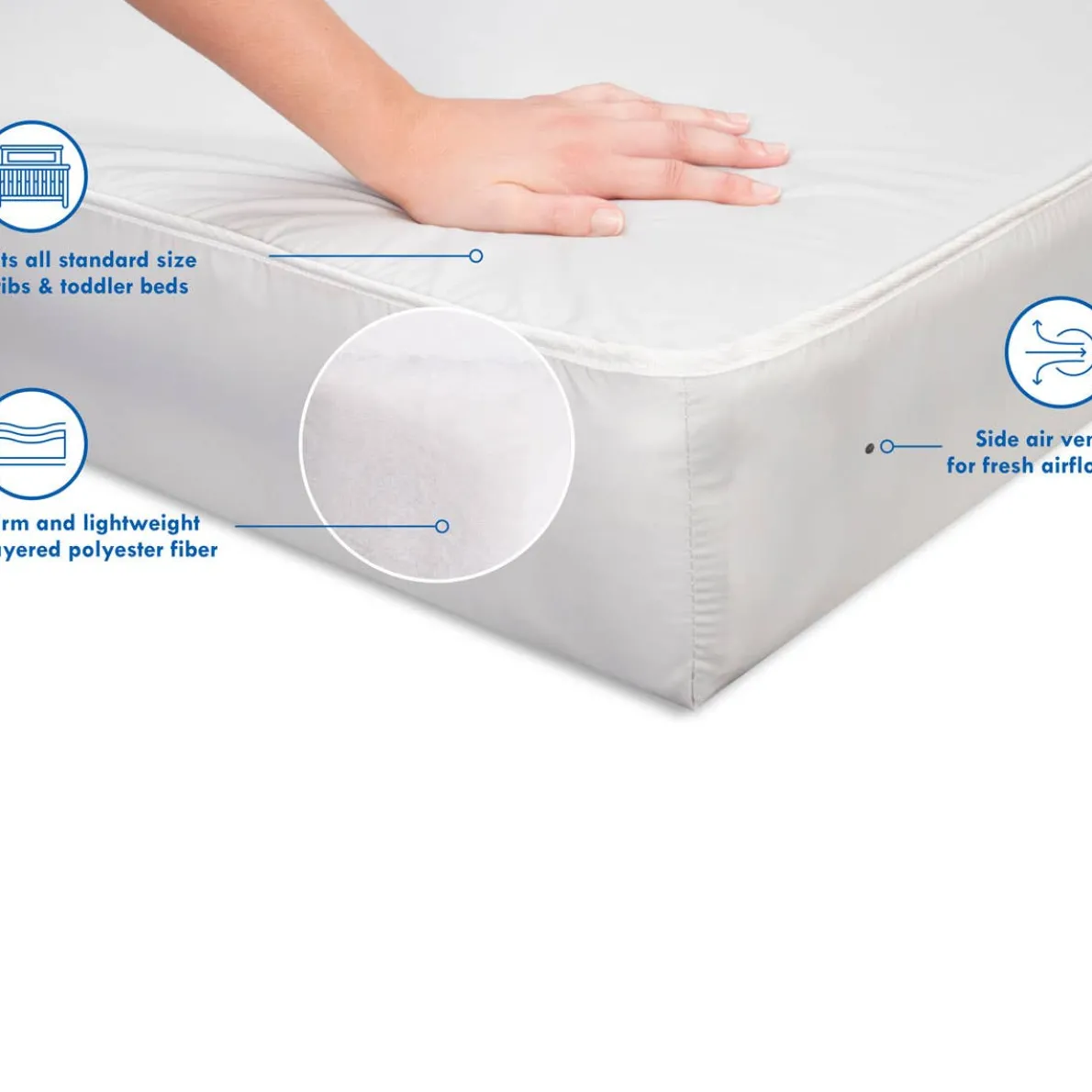 The DaVinci Complete Slumber Waterproof Crib & Toddler Mattress is designed with layers of high-density polyester fiber for a firm sleeping surface that is GREENGUARD Gold certified, so your baby can sleep safely and comfortably. This mattress features a waterproof, tear-resistant cover that will stay new through years of use.
