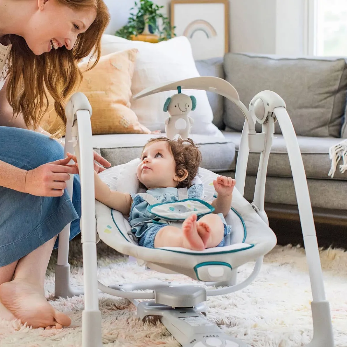 - Bring baby’s favorite seat on-the-go with this small baby swing