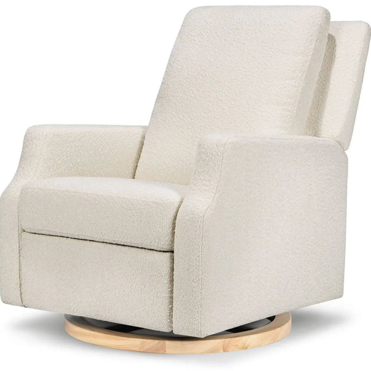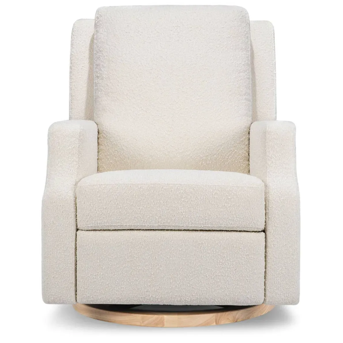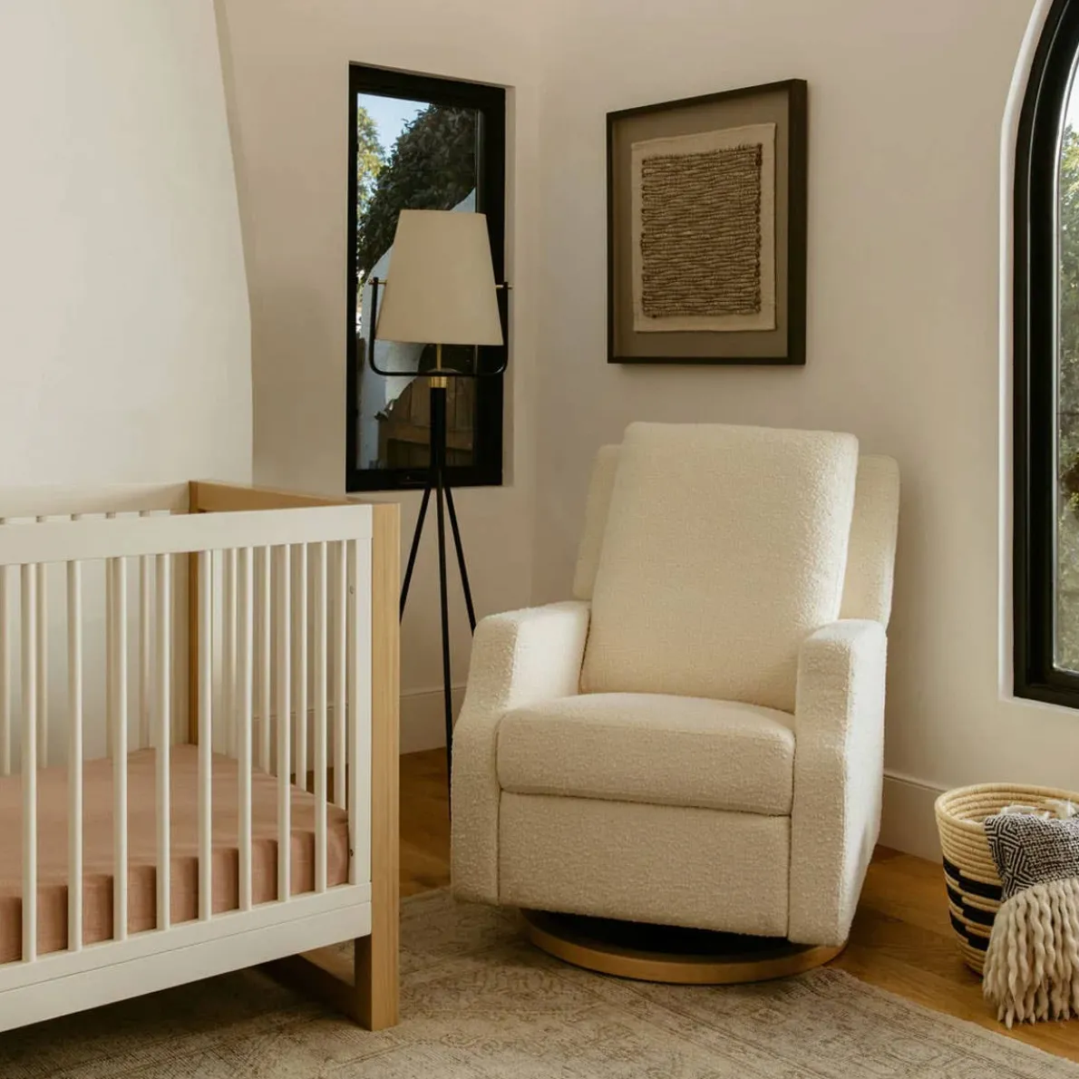 The Crewe Recliner blends form and function with its crisp, contemporary design and comfortable seat. Its smooth, back-and-forth gliding motion helps you rock your baby to sleep with ease, while the plush back cushion, hidden recline mechanism, and convenient swivel create an inviting repose for both you and your baby.