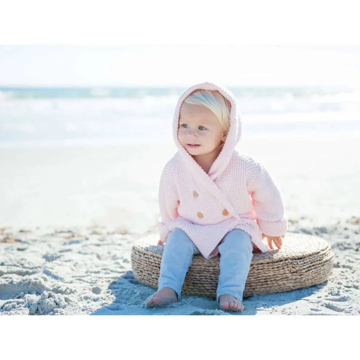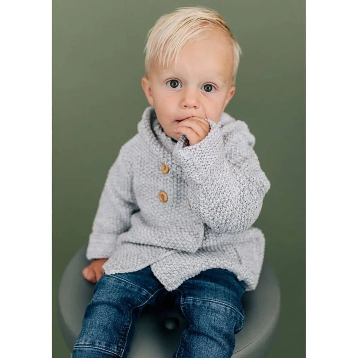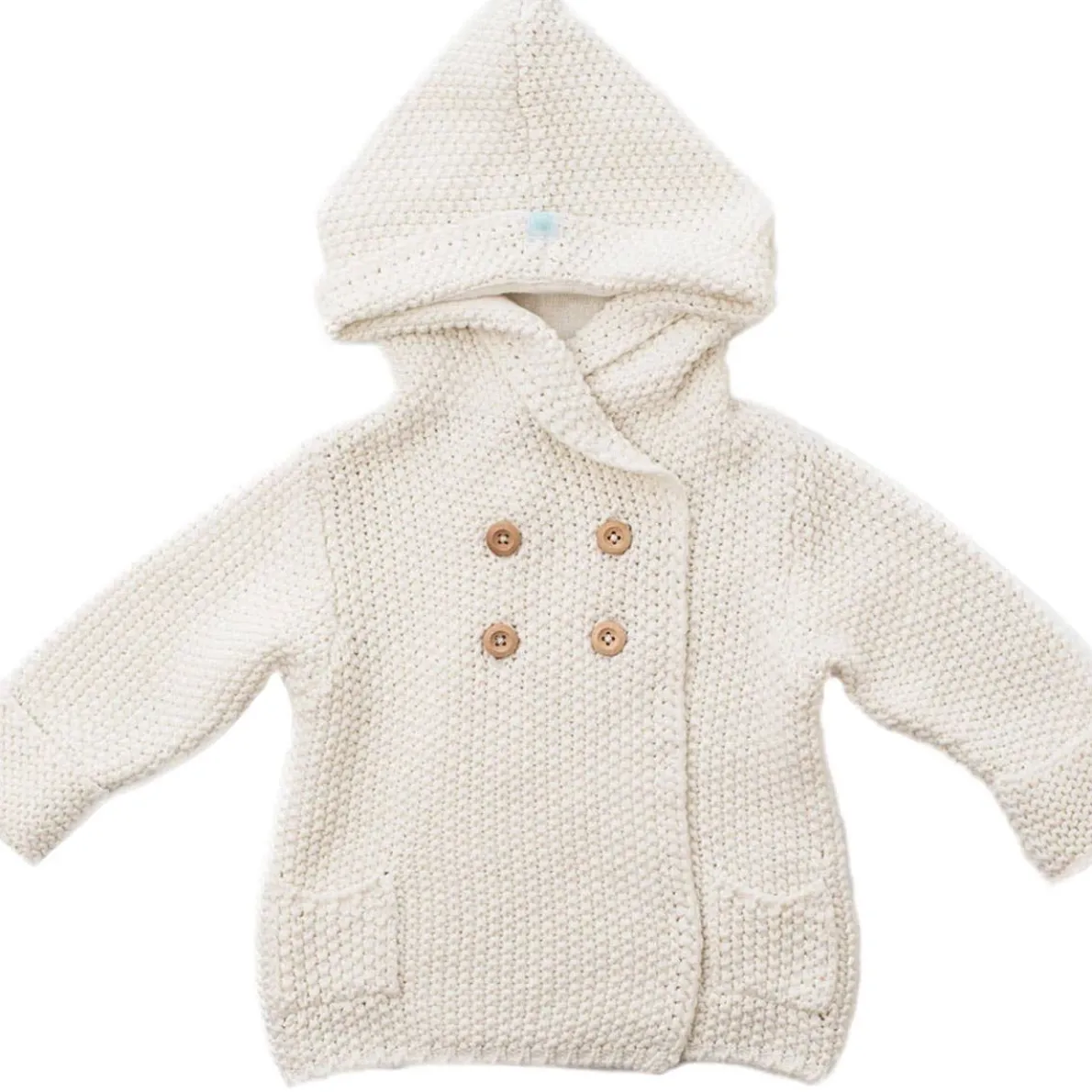 This adorable crochet knit hoodie is made with all cotton fibers and has handcrafted wooden buttons and an oversized hood.