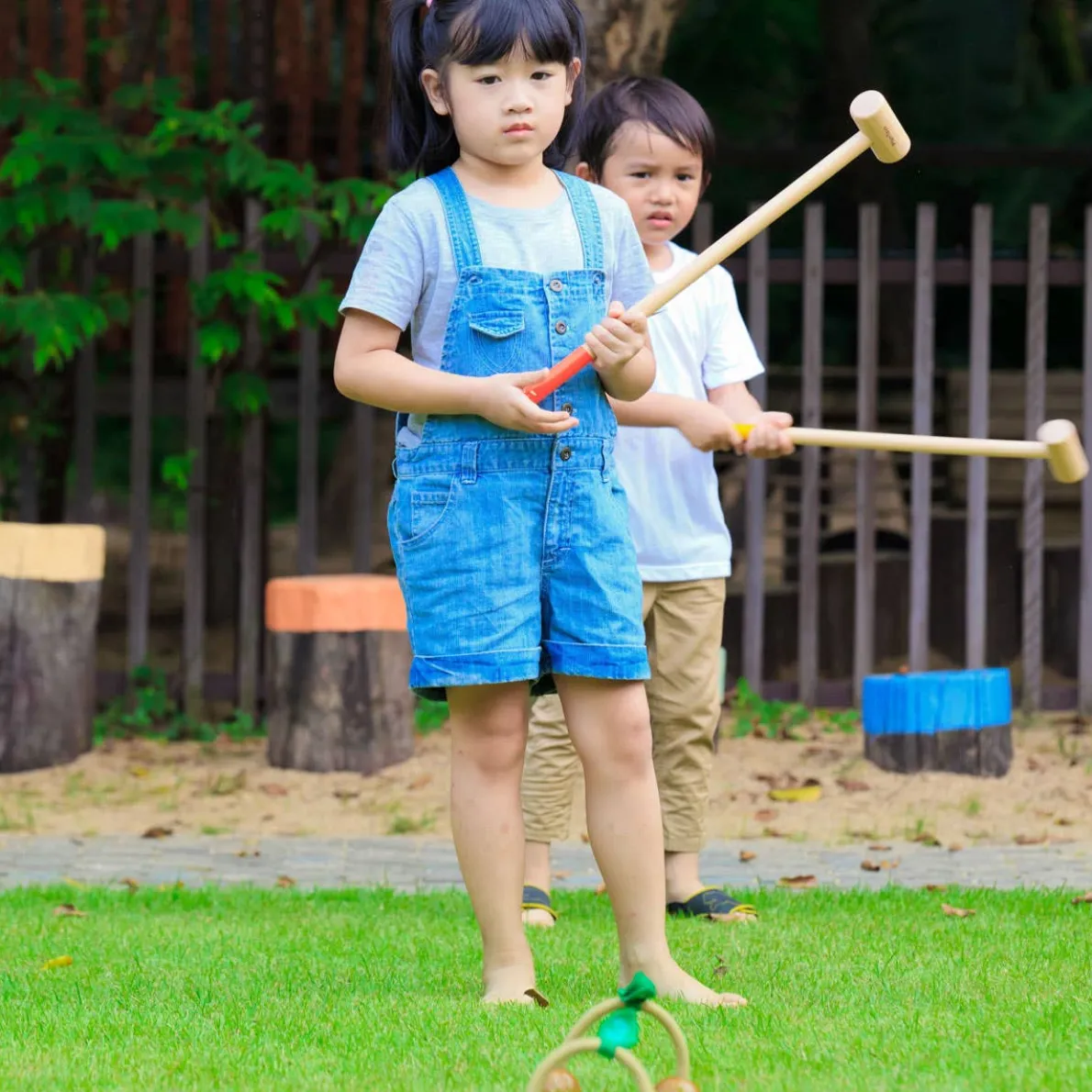 A favorite family game with a very friendly design. The colorful Croquet set can be played in several adjustable settings. The set includes 4 different animal wooden balls – bird, tiger, monkey and frog, 2 mallets, 4 wickets and a final stand.