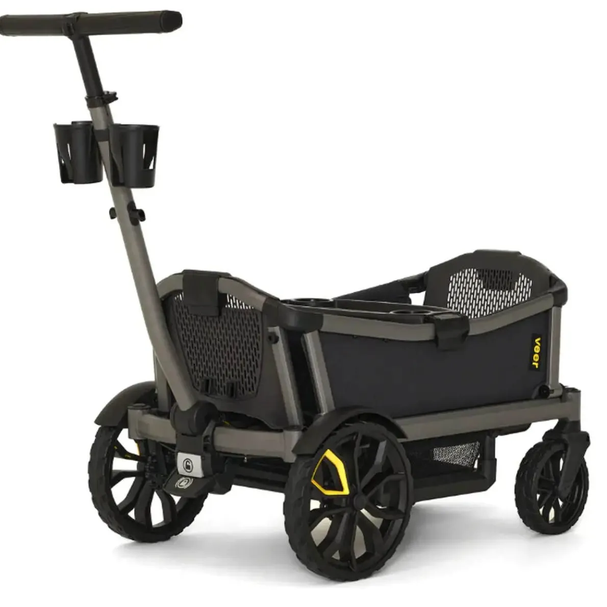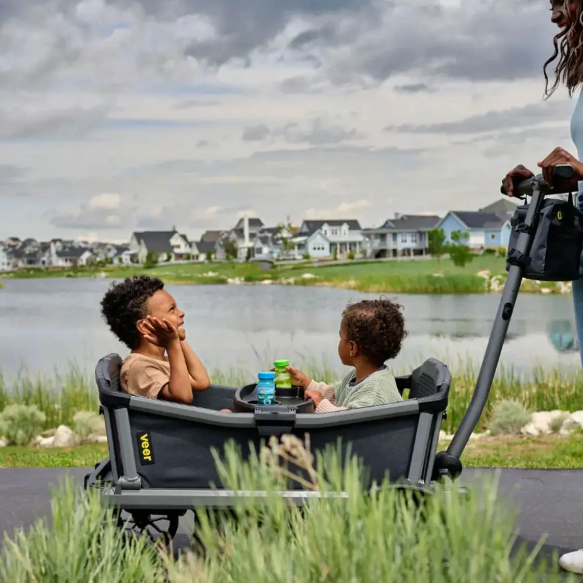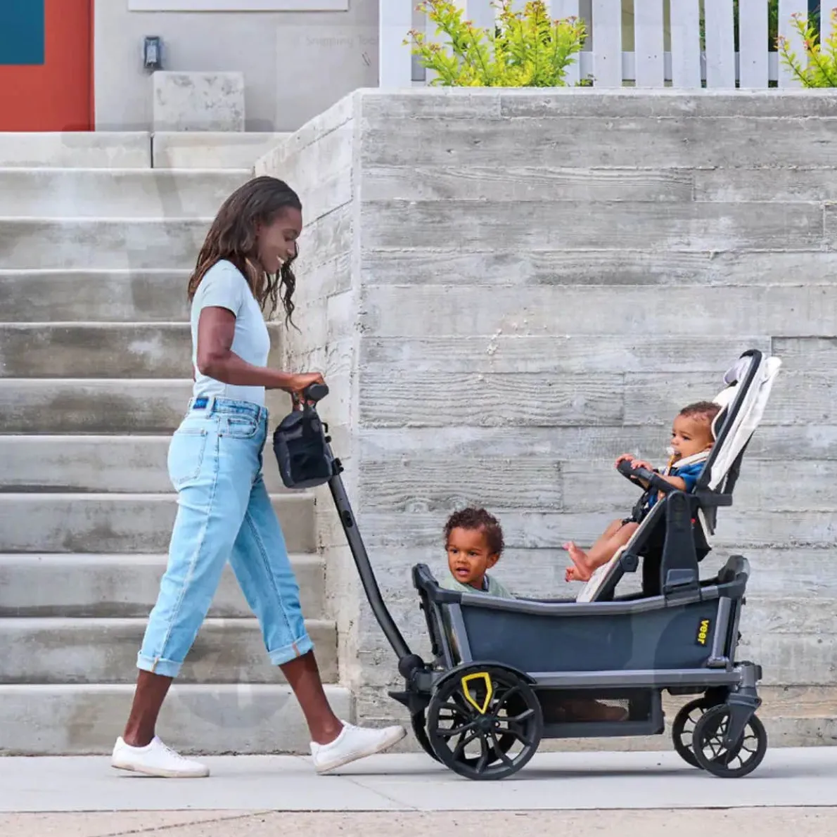 Cruiser City gives your family the fun and all-terrain versatility of a Cruiser but offers the push steering and ample kickspace of a traditional stroller. Cruiser City is perfect for families that love to push on sidewalks, paths and through local attractions with seating for 2.Cruiser City features swivel wheels furthest from the handle, which enable it to be steered like a traditional stroller when pushing on smooth terrain. But don’t worry, the handlebar can also drop into wagon mode for pulling over uneven terrain.