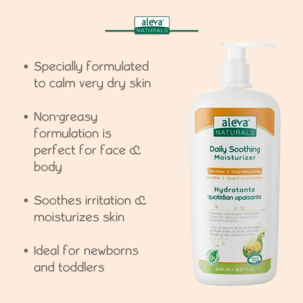 To ease the pain of dry and chapped skin, moisturizing is key. Traditional lotions are water-based and just moisturize the surface of the skin, providing short term results. Aleva Naturals Daily Soothing Moisturizer is an emulsion that penetrates deep within the skin providing deep hydration. This is why our Daily Soothing Moisturizer has long lasting results and allows the skin to breathe while being grease free! With its soothing blend of Oatmeal Extracts, Bisabolol, Jojoba oil and Vitamin E, Daily Soothing Moisturizer helps to reduce redness and dry, chapped skin associated with eczema and other skin maladies. Designed for babies, but effective for the whole family!