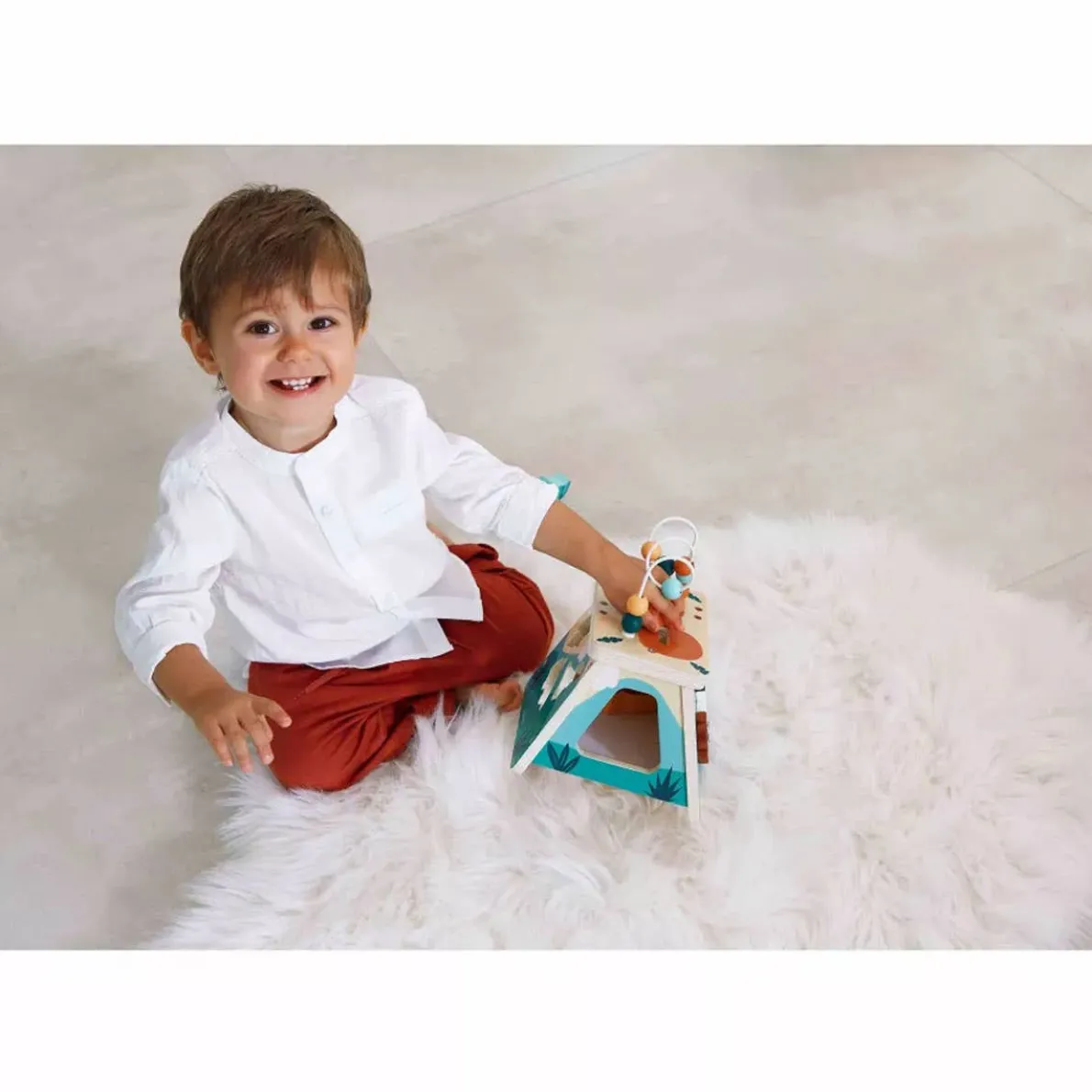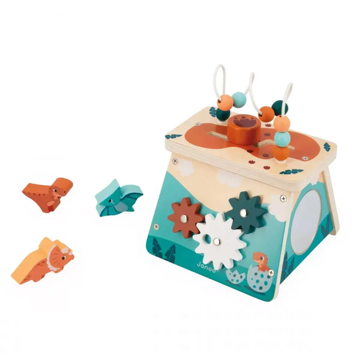 What a pretty dinosaur-themed shape-sorting box! You’re bound to love the colours and details found on this easily transportable play cube. This multi-activity volcano boasts multiple games that will appeal to children aged 12 months and up. The front features a shape sorter with wooden dinosaurs to slot through the correct holes. Toddlers will need to scratch their brains to figure out where to place the cute Tyrannosaurus, Triceratops and Pteranodon! The dinosaurs won’t make any noise when they drop, thanks to the felt at the bottom of the box. Then plunge your hand into the side to retrieve all the wooden pieces. The back boasts 3 gears that will introduce little ones to the world of rotation and speed, whilst also developing their dexterity. On the left side, baby will have fun starring at their reflection in a mirror, while there are 2 other games on the top of the volcano: a maze and an abacus with 8 wooden beads. This beautiful early-learning toy is made from FSC® wood.