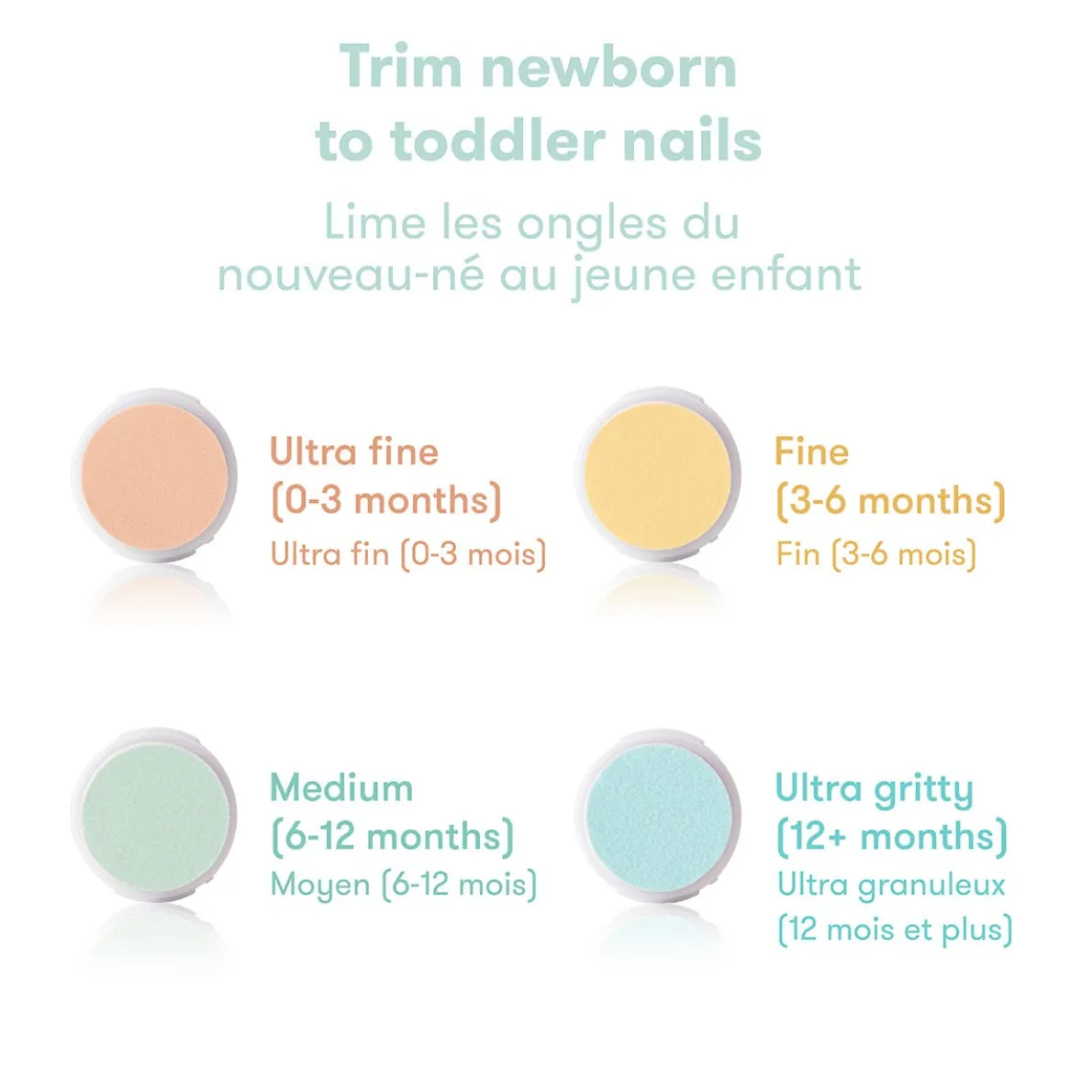 - EASY-TO-USE: Easily change speed, direction, and grit with four interchangeable buffer pads for newborn nails to kid claws (Orange: Ultra fine, Yellow: Fine, Green: Medium, Blue: Ultra Gritty)