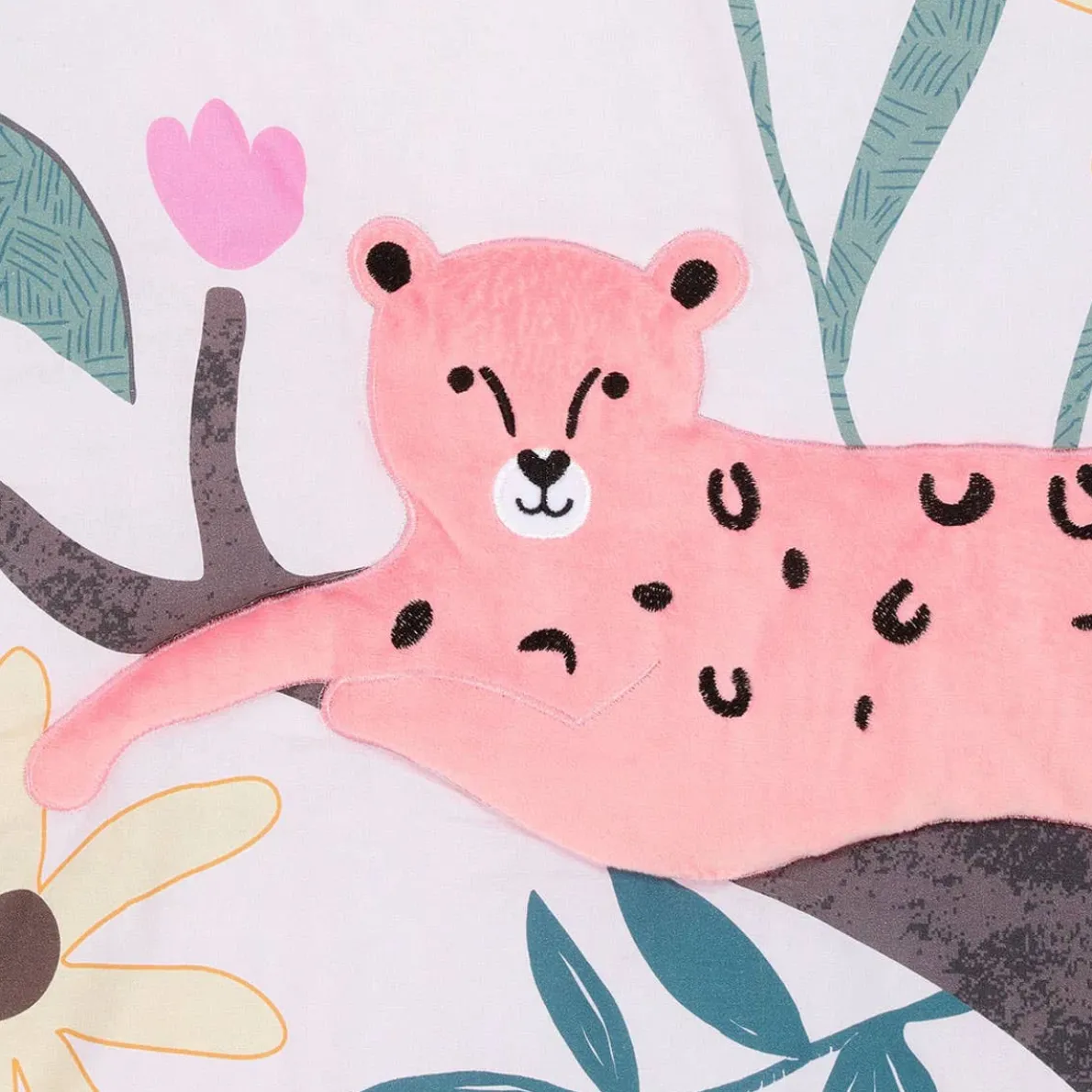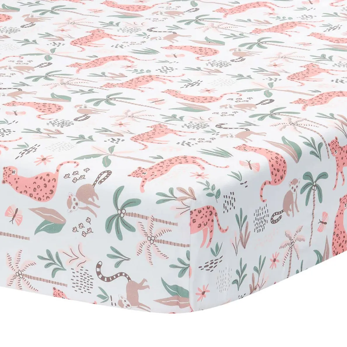 Create the purr-fect Enchanted Safari theme with this amazing jungle collection. The three-piece crib bedding set includes one quilt, one breathable 100% cotton fitted crib sheet, and one crib skirt. The quilt is on a soft pink cotton twill and includes an appliqued leopard, mommy and baby lemurs, a toucan, large trees, butterflies, and flowers all expertly appliqued and embroidered. The breathable 100% cotton fitted crib sheet is on a crisp white ground with leopards, lemurs, butterflies, trees, and flowers. There is elastic all the way around ensuring a safe and secure fit on a standard size crib mattress measuring 28” x 52”. The crib skirt adds the finishing touch to your child’s crib. The upper panel is on a pale pink ground with small, tossed stripes. The lower panel is a solid peachy pink twill with white fringe in between. It has a 14 ½” drop.