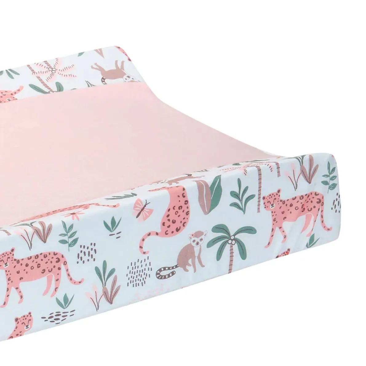 A soft pink velour center is perfect for changing your little one. The elastic side panels are cotton in an adorable jungle safari print with leopards, lemurs, trees, bushes, butterflies, and flowers. There are buttonholes for the changing pad straps so your little one is safe and secure while getting their diaper changed. Machine washable for easy care.