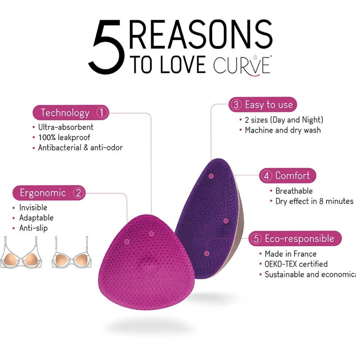 The Essential Day package is made of 2 Day washable nursing pads. Real jewels of innovation, Curve washable nursing pads guarantee a total absorption and optimal comfort all day long thanks to its unique ergonomics. Their fabrics respect the skin, and are anti-bacterial and anti-odour to ensure maximum daily freshness. Besides maximum absorption, Curve’s washable nursing pads have a unique anti-slip system to hold perfectly in place in the bra all day long. Because today moms are active, the washable nursing pads can be machine washed and machine dry. Curve washable nursing pads are made in France.