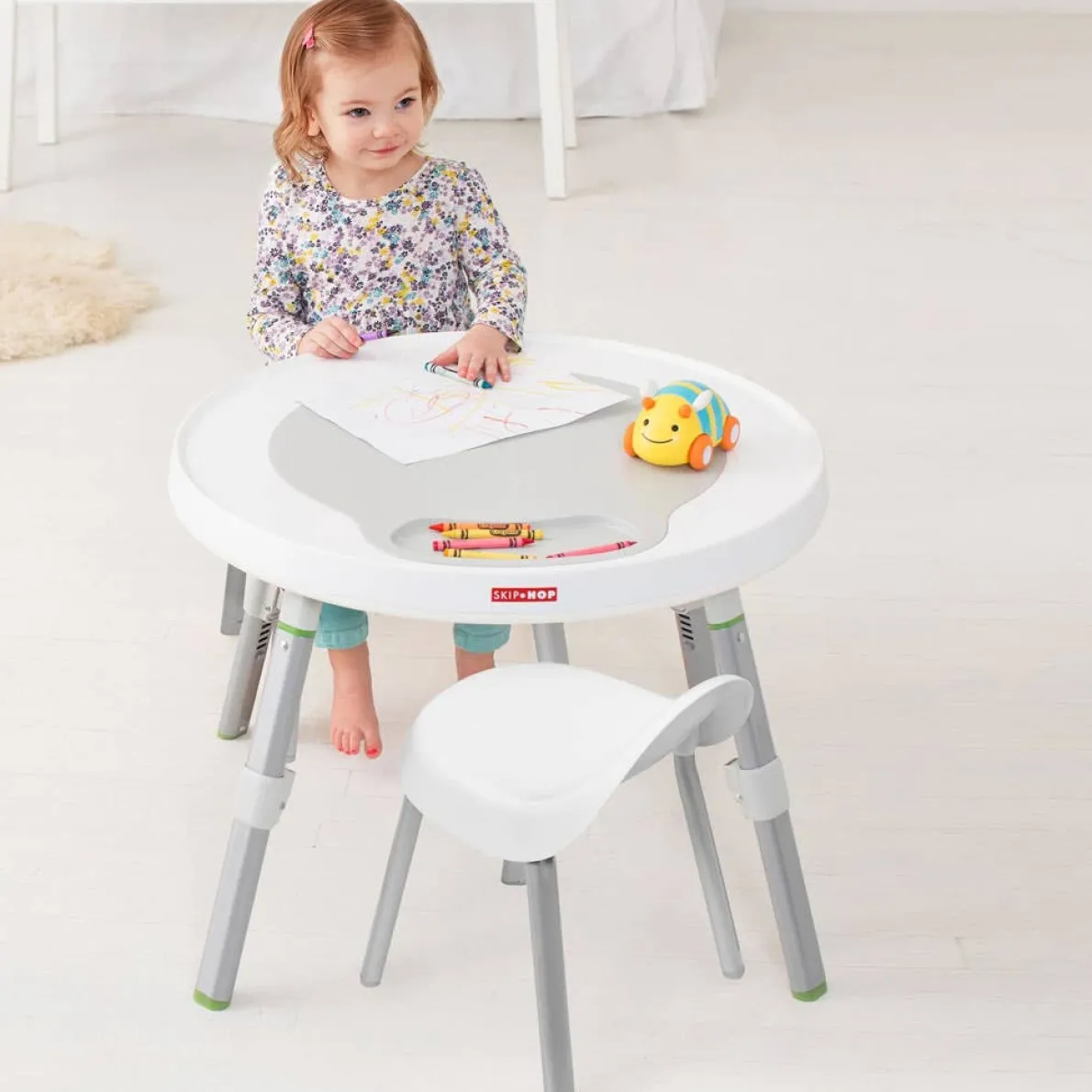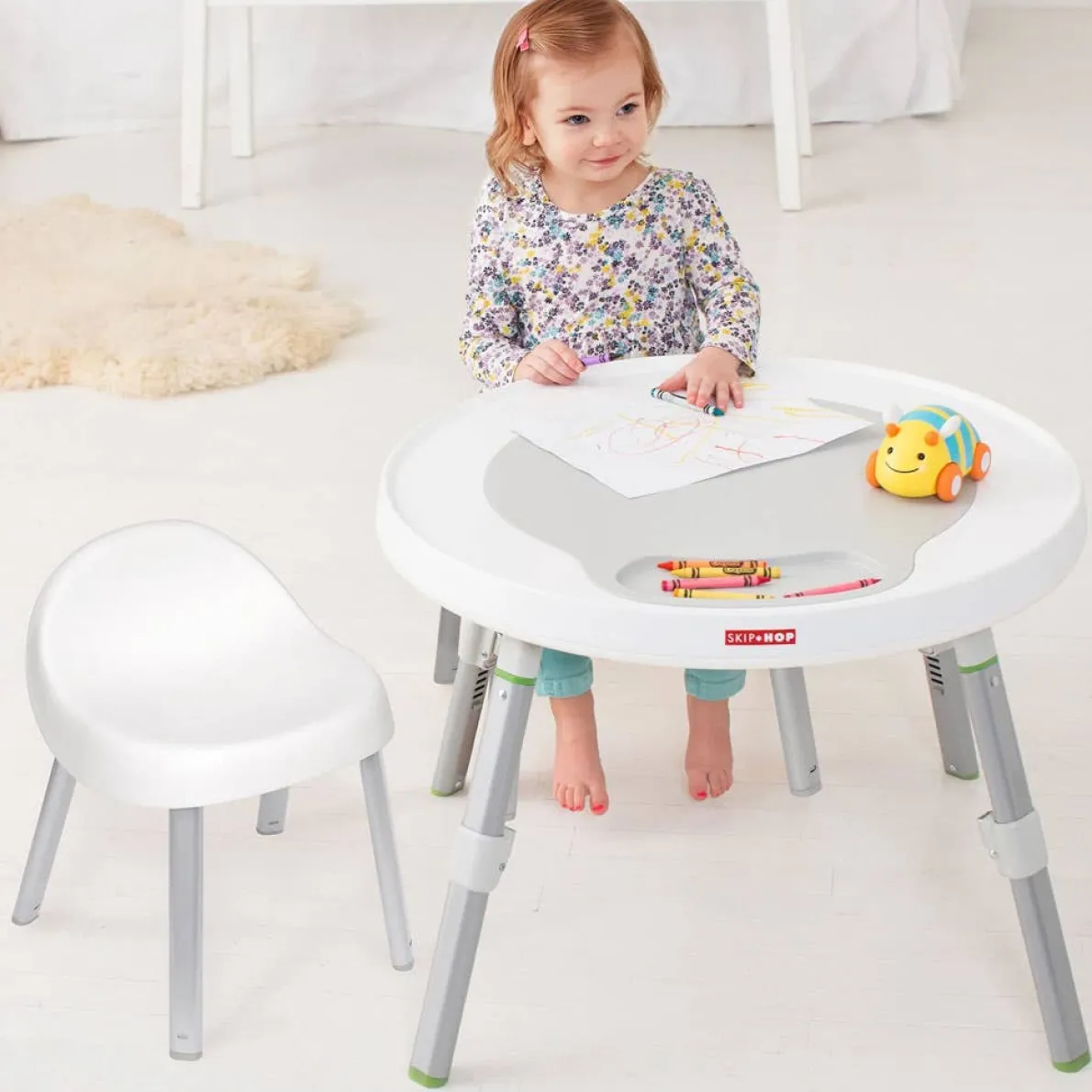 Sized just right for little ones, Skip Hop’s modern kid chairs are right at home in any decor. Featuring a contoured seat and back for superior comfort, they’re finished with detachable, sturdy metal legs with non-slip rubber feet so they’re easy to store. A perfect match for Baby’s View Activity Center when used as a play table.