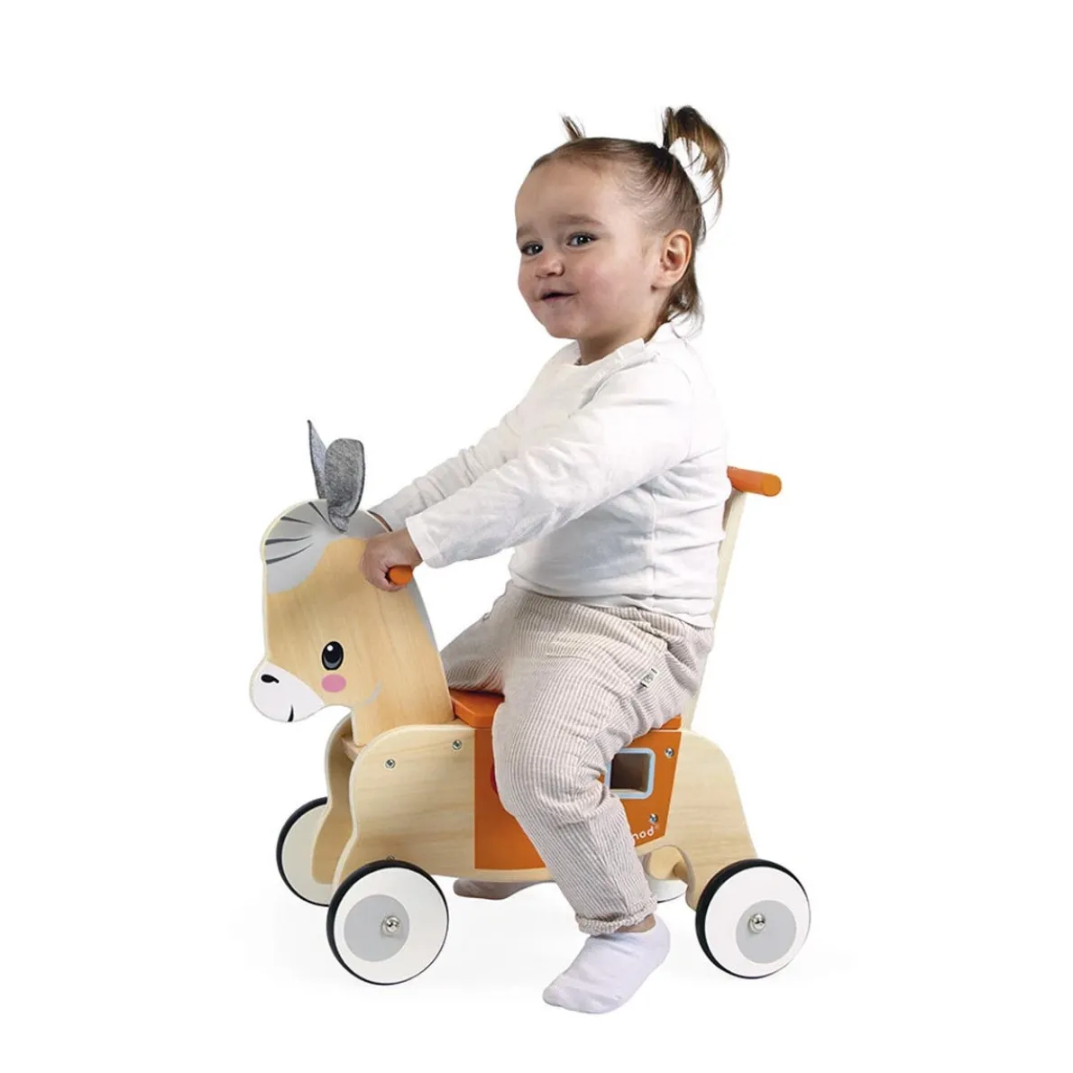 Little donkey can’t wait to discover the world, and neither can baby! With this wooden donkey carrier, you’re on your way to new adventures, from 12 months. Come on, hu! By riding his carrier, baby develops his sense of balance and gross motor skills, while discovering his environment. Want to push your toy or be pushed? Thanks to the handle on the back! Whichever way your little one uses his carrier, he’ll learn to manage his weight and have a great time. The little extra for this early-learning toy? The shape box included, with 6 shapes to insert and retrieve from the front, so you can start all over again. Perfect for practising dexterity! Last but not least, the 4 rubber wheels are quiet and provide a good grip, so you can walk around in complete peace of mind. Ideal for encouraging gross motor skills and strengthening support for walking, this wooden carrier is a real eye-catcher, with its little felt ears and soft colors. Whether your little one loves farm animals or simply trotting, he’ll be delighted! This early-learning toy is made from FSC™-certified wood from sustainably managed forests.