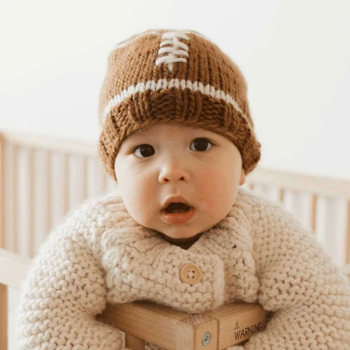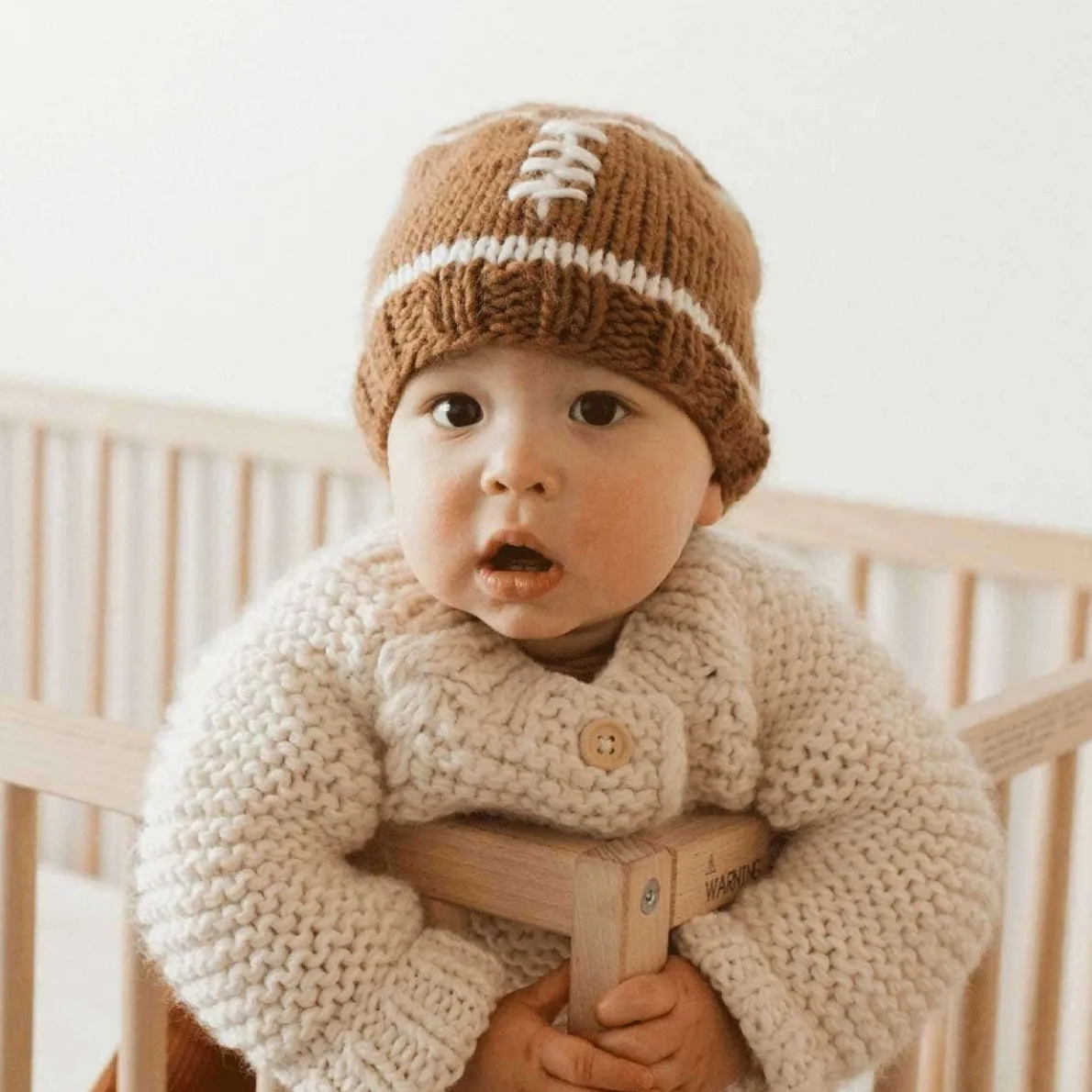 Fun football beanie hat is perfect for football lovers. It’s perfect for cheering on your team, first portraits and makes a great gift. Hand knit in cozy Brown yarn with White accents.