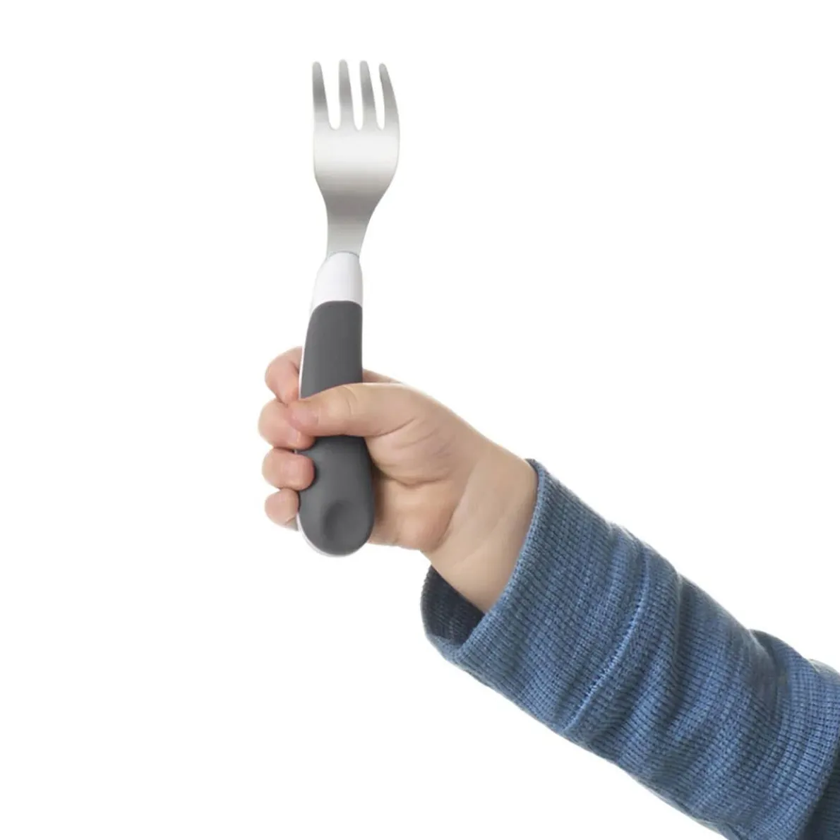- A flat spot on the handles prevents the Fork and Spoon from rolling off the table or high chair tray and the soft grips are shaped to keep them from sliding into bowls or plates.