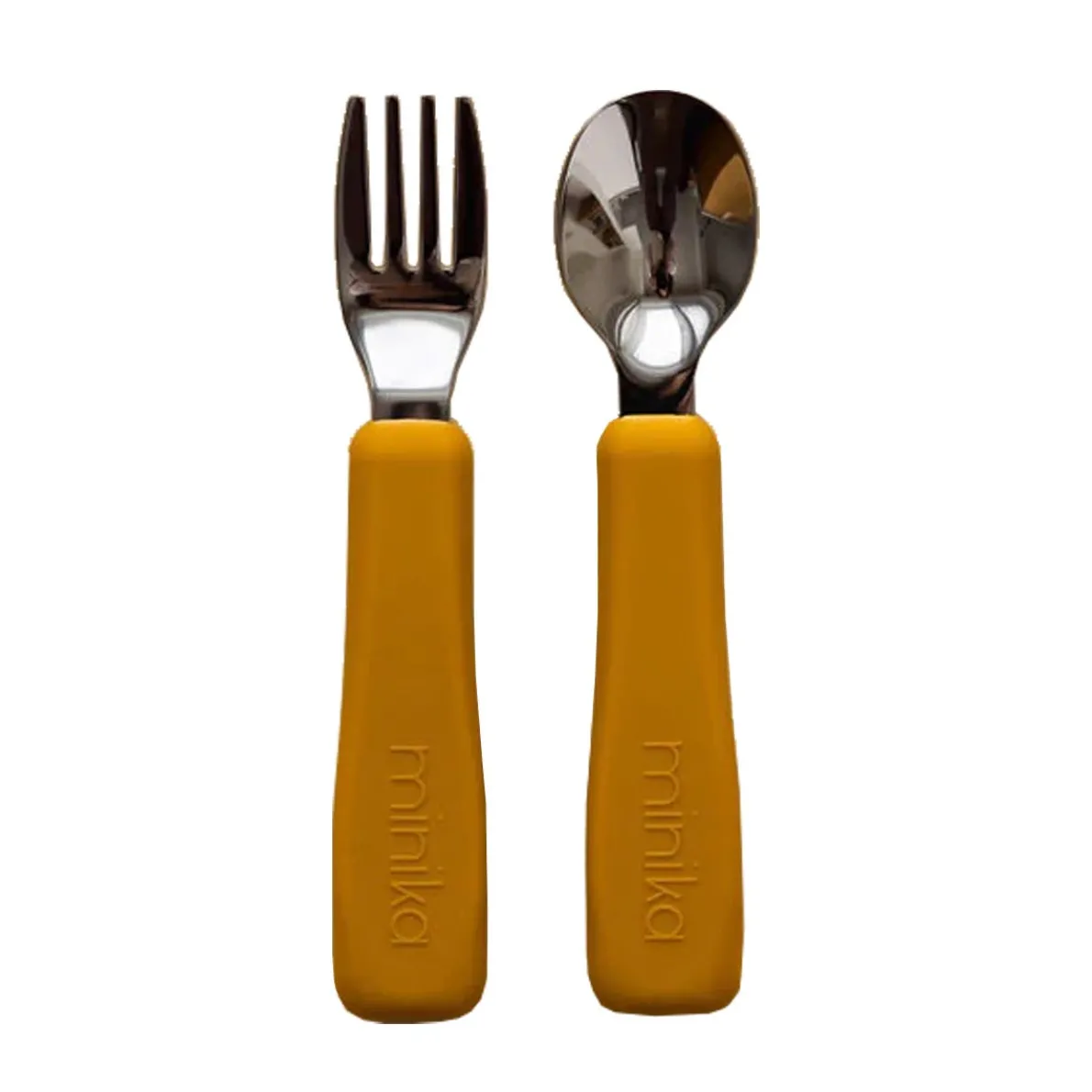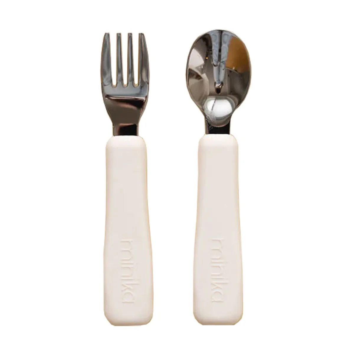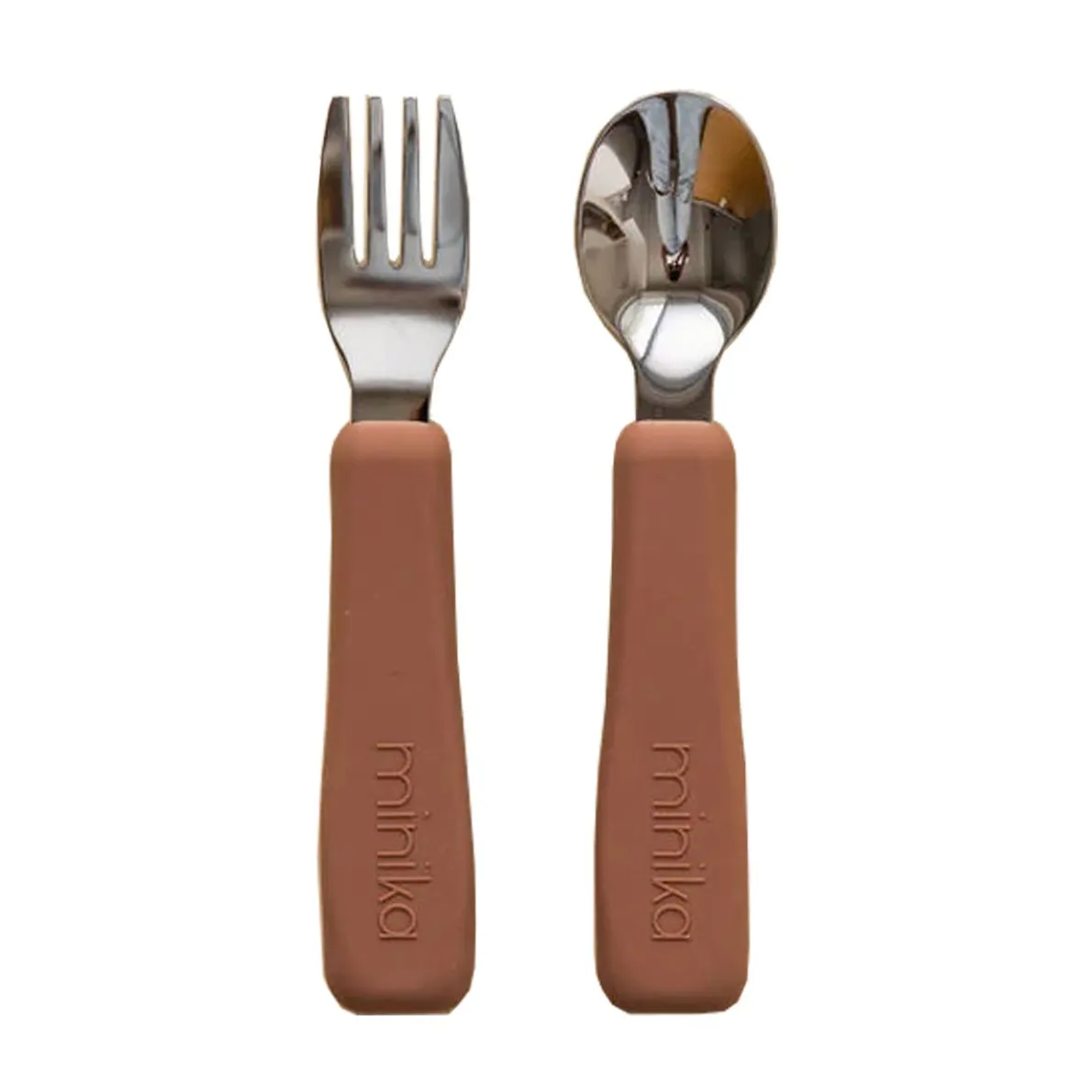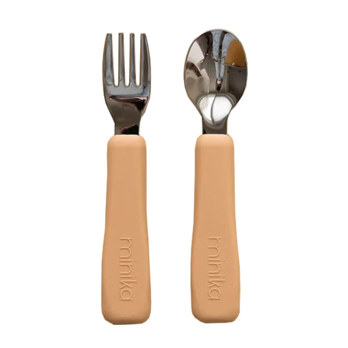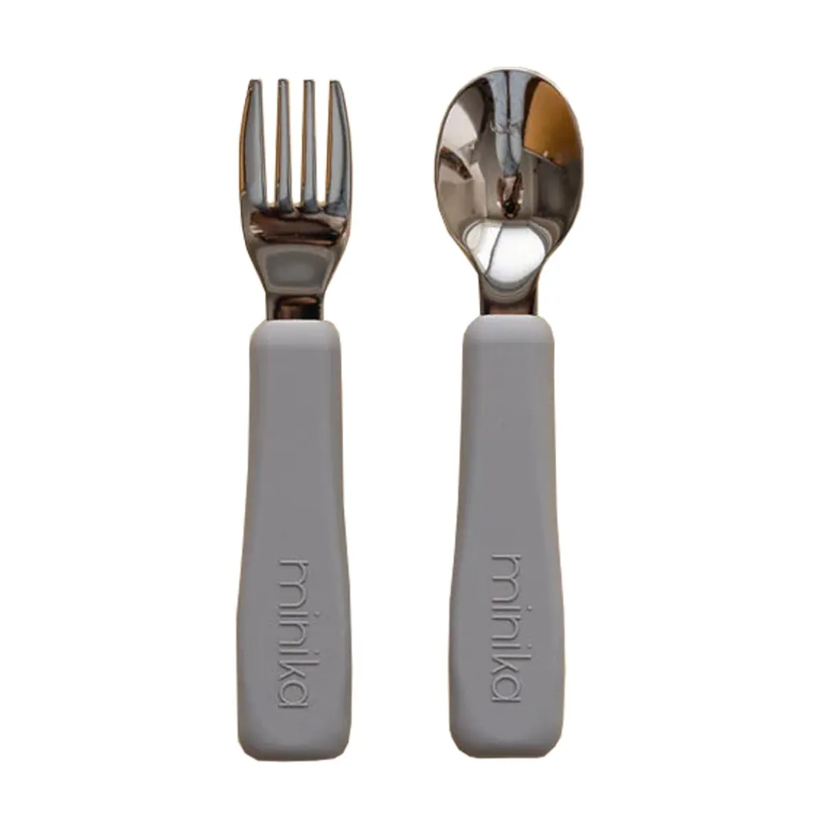 Fork and spoon set. Food grade silicone. BPA, PVC, lead and phthalates free. Easy to wash in the dishwasher or with soap and damp cloth. Stainless steel. Non-slip silicone grip.