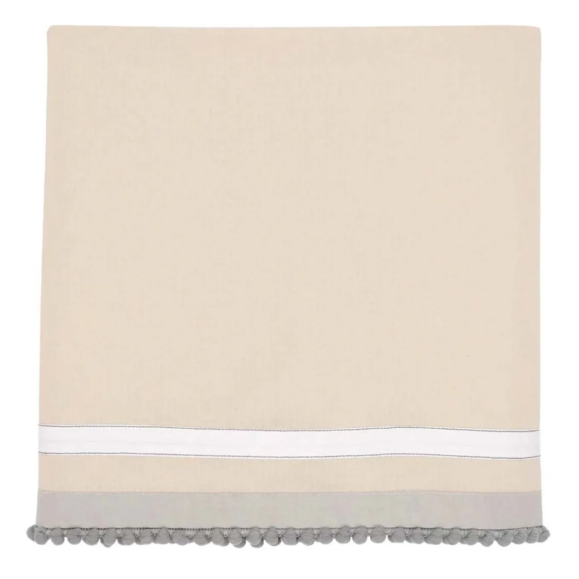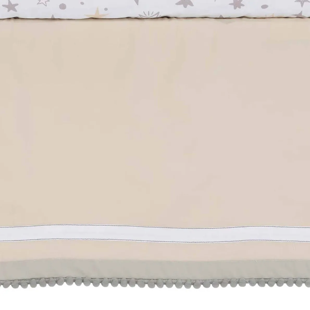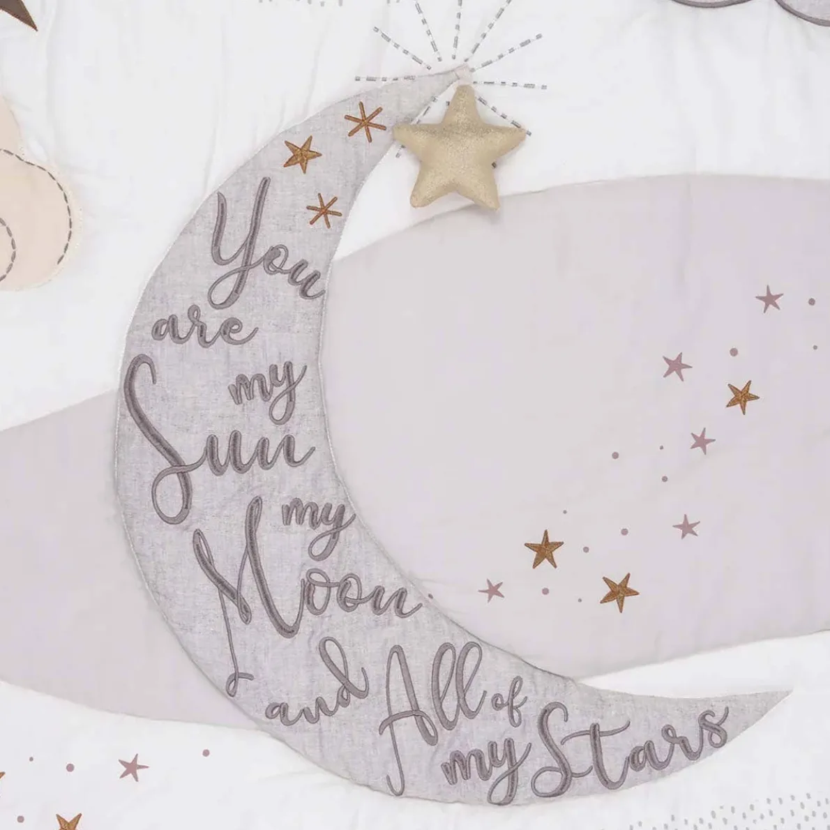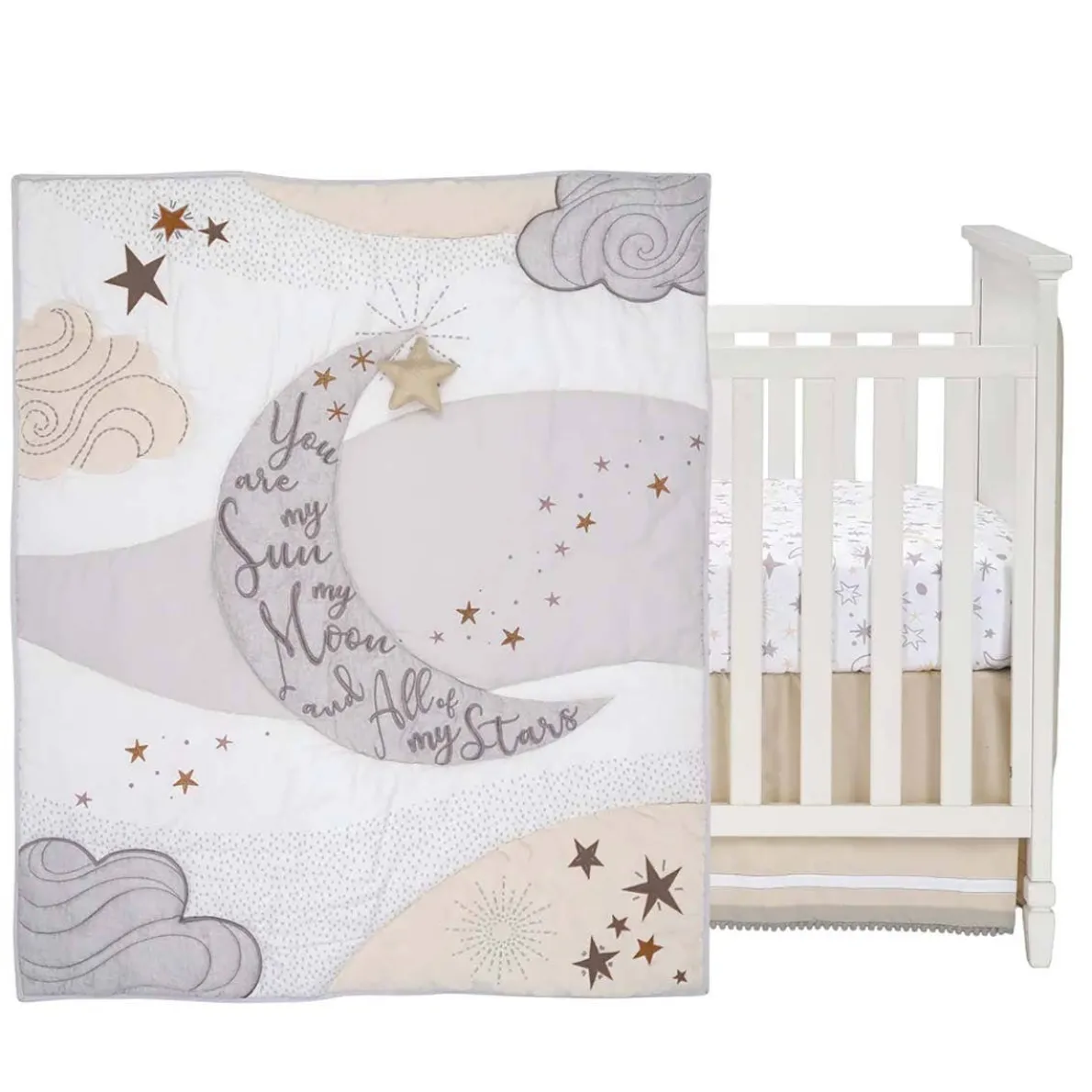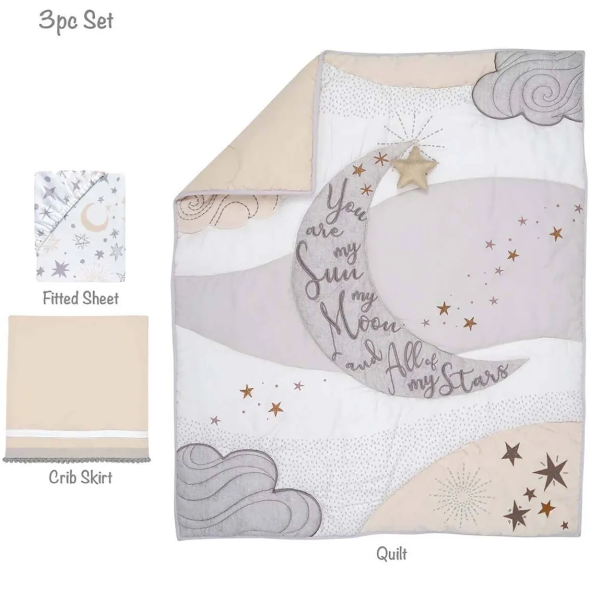 Your little one will reach for the stars with this dreamy gender-neutral three-piece nursery crib bedding set. The set includes one quilt, one breathable 100% cotton fitted crib sheet and one crib skirt. This amazing cotton sateen quilt front is expertly embroidered and appliqued. There are heather gray chambray clouds, creamy velour appliqued cloud, appliqued copper stars, and a large embroidered crescent moon with a 3-dimensional star and the words, “You are my sun my moon and all of my stars” embroidered in script writing. The back of the quilt is a 100% creamy cotton twill. The fitted crib sheet is 100% cotton and is a tossed print of crescent moons and stars on a soft white ground. The fitted crib sheet has elastic all the way around ensuring a safe and secure fit on a standard size crib mattress. The crib skirt adds the finishing touch to your child’s crib. It is made in a cotton twill in a lovely creamy color. There is a ¾” wide white twill tape along with gray pom poms.
