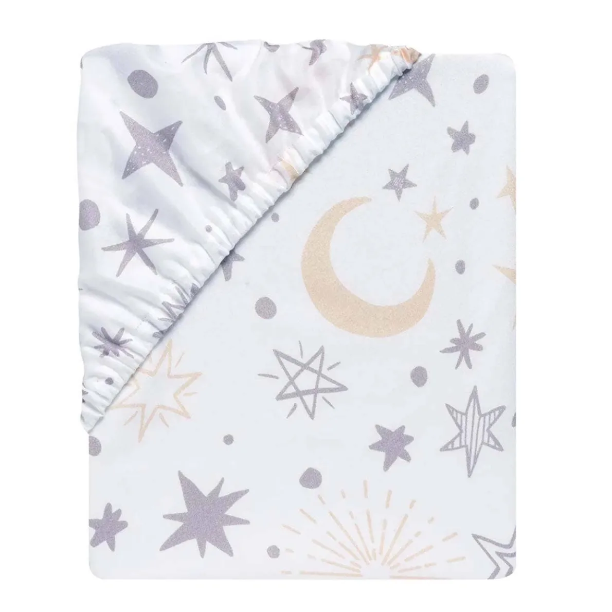Tossed crescent moons and stars decorate this breathable 100% cotton fitted crib sheet. It is on a soft white background with multiple sized stars that are gray and copper. The sheet has elastic all the way around ensuring a safe and secure fit on a standard sized crib mattress measuring 28” X 52”.