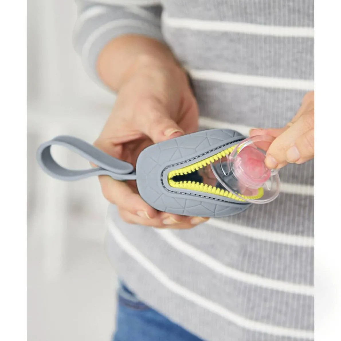 With a secure zip closure and a modern compact shape, Skip Hop’s silicone pacifier holder keeps pacis clean and ready to go. Designed to fit up to two pacifiers, the soft silicone material is dishwasher safe so it’s easy to clean. A handy strap attaches to your stroller or diaper bag so baby’s pacifier is always within easy reach.