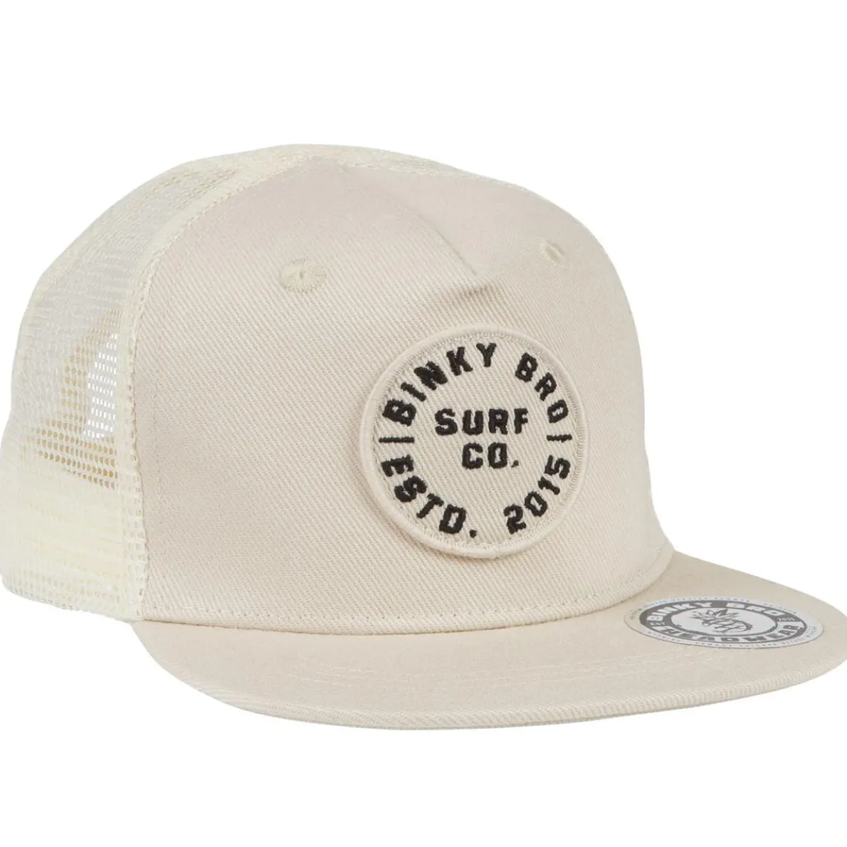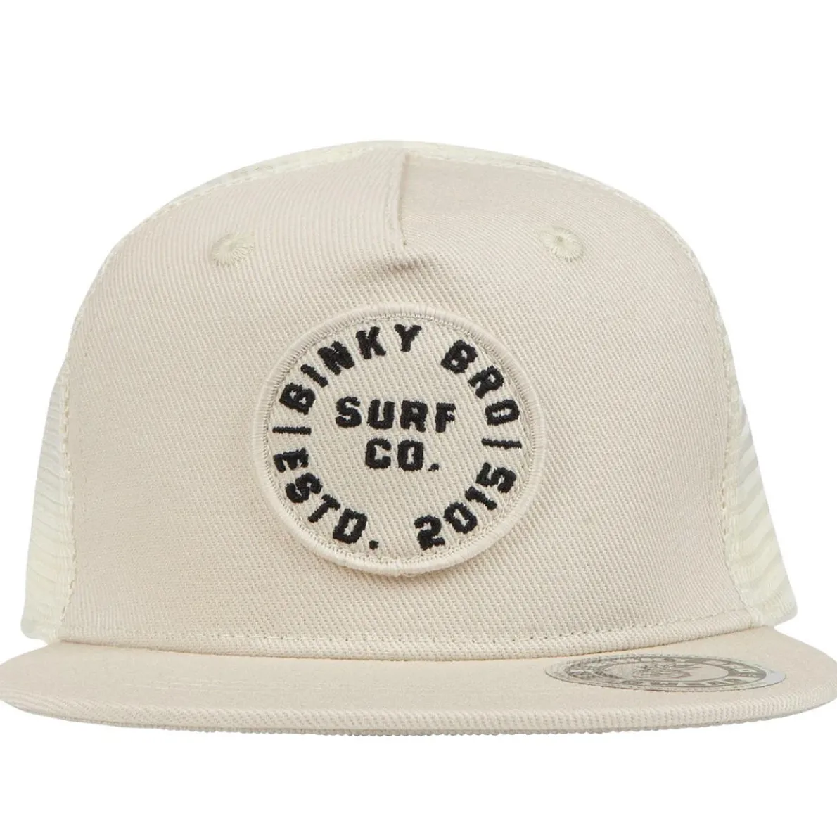 - The Kandui snapback hat has cream paneling, a cream bill, with a cream and black embroidered “Binky Bro” patch on the front.