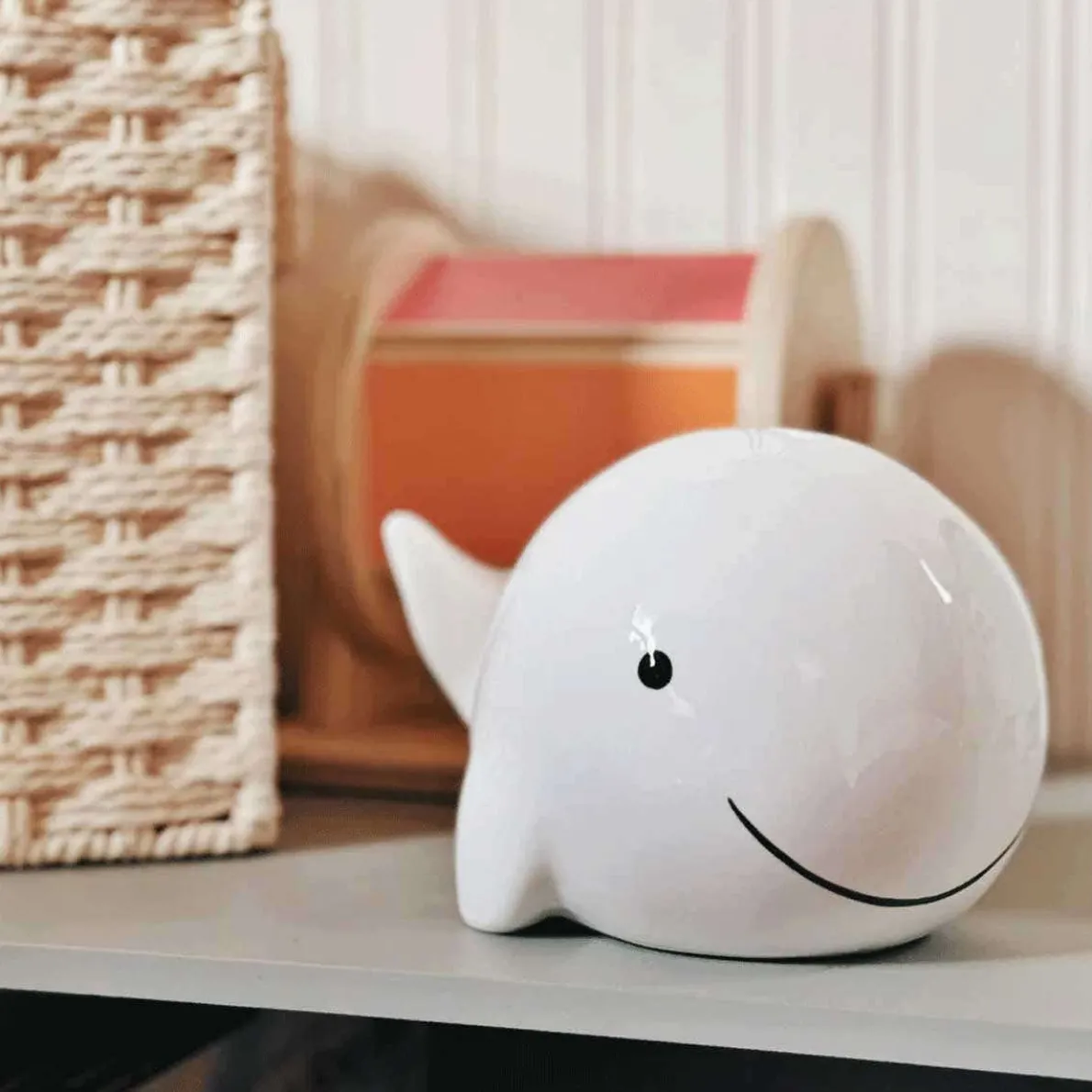 All Child to Cherish banks are made from only the highest quality ceramic, known as dolomite, for increased durability. They feature a base that is deep glazed, insuring that this essential colour doesn’t wear off with repeated handling. To finish things off, they add a shiny finishing that keeps the colours of all of the underlying components locked in place, meaning that you never have to worry about compromising the quality of the bank with repeated use. A charming ceramic bank is shaped like a playful whale sporting a wide smile.