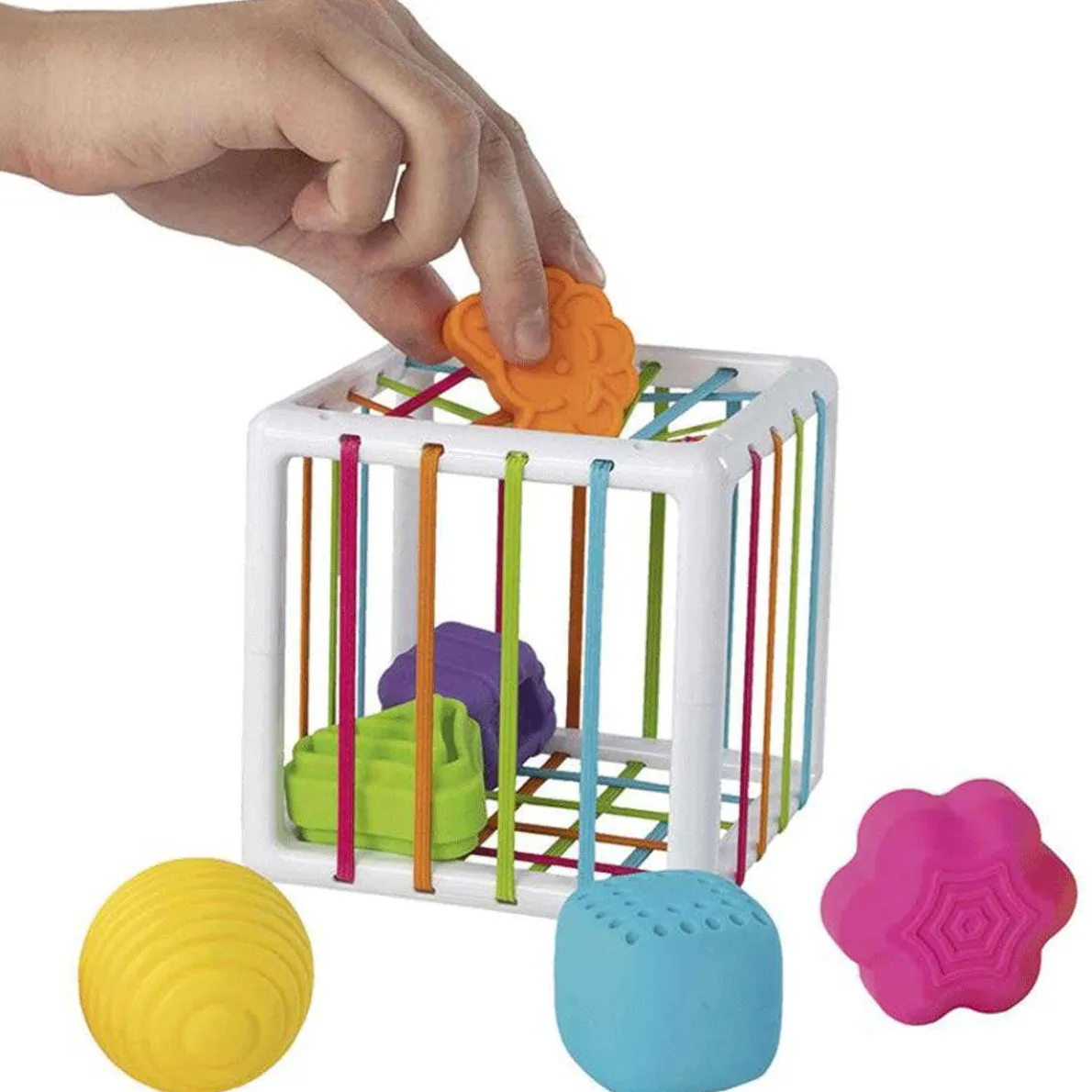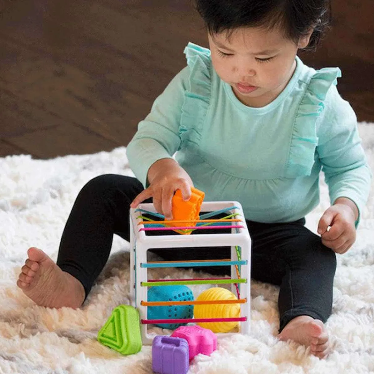 An incredibly unique shape-exploration experience! The six chunky shape blocks are each designed with fascinating textures that are sure to thrill the fingers. There’s a cube, a diamond, a sphere, a triangle, a flower, and the happy Fat Brain logo. But the best part? As kids push the shapes through the elastic bands of the cube, curiosity is sparked and young minds can’t help but explore, experiment, and discover.