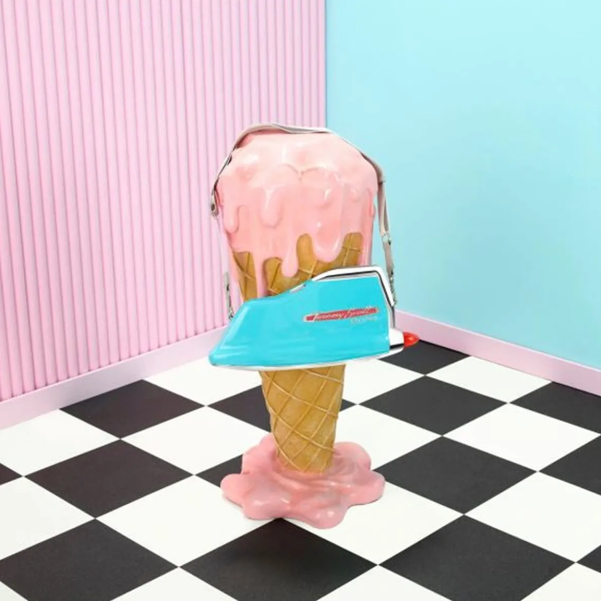 Jeremy Scott signature tailfin design with its distinctive red light and chrome detailing adds a playful edge to your essential bag.