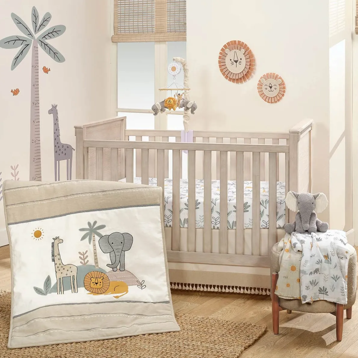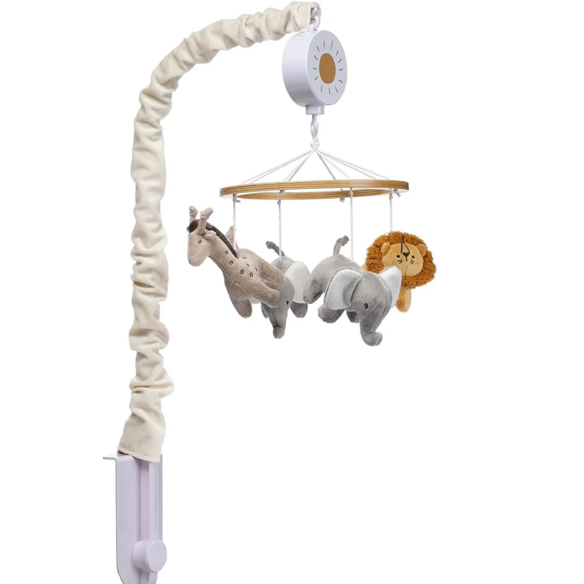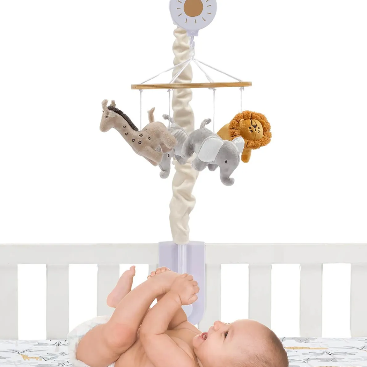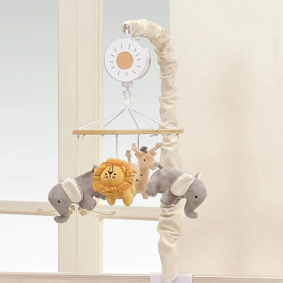 - Two gray elephants with white ribbed velour ears, one lion with a curly boucle mane, and one majestic giraffe rotate around this charming musical mobile