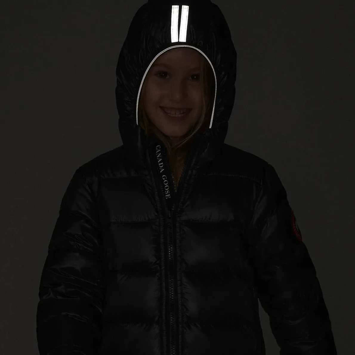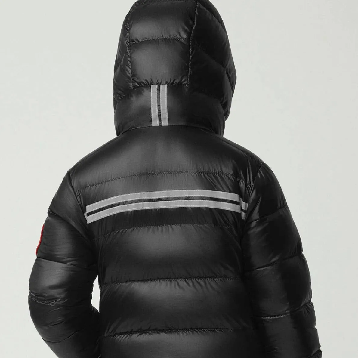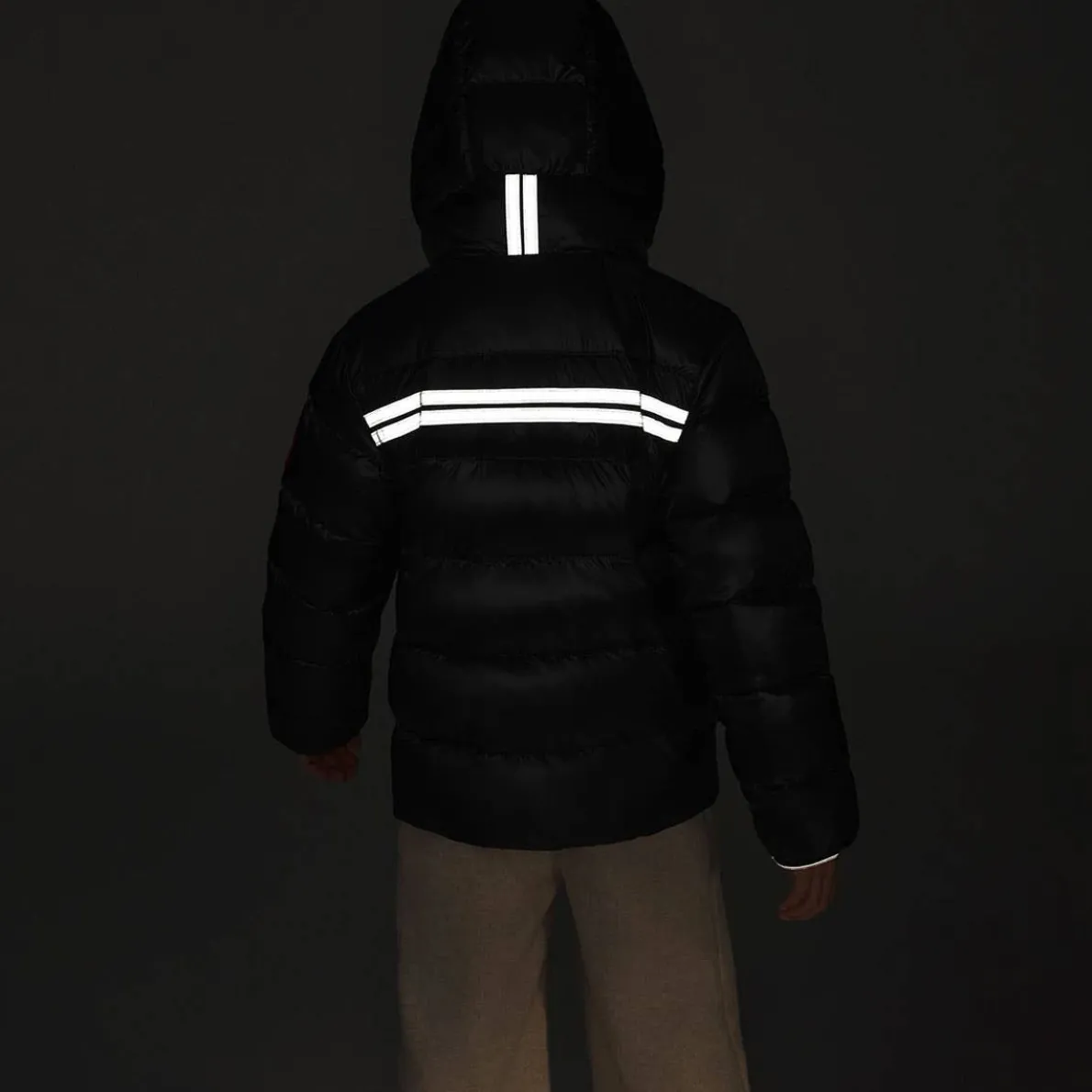 - Down-filled adjustable hood with reflective trim stitching adds warmth and element protection.