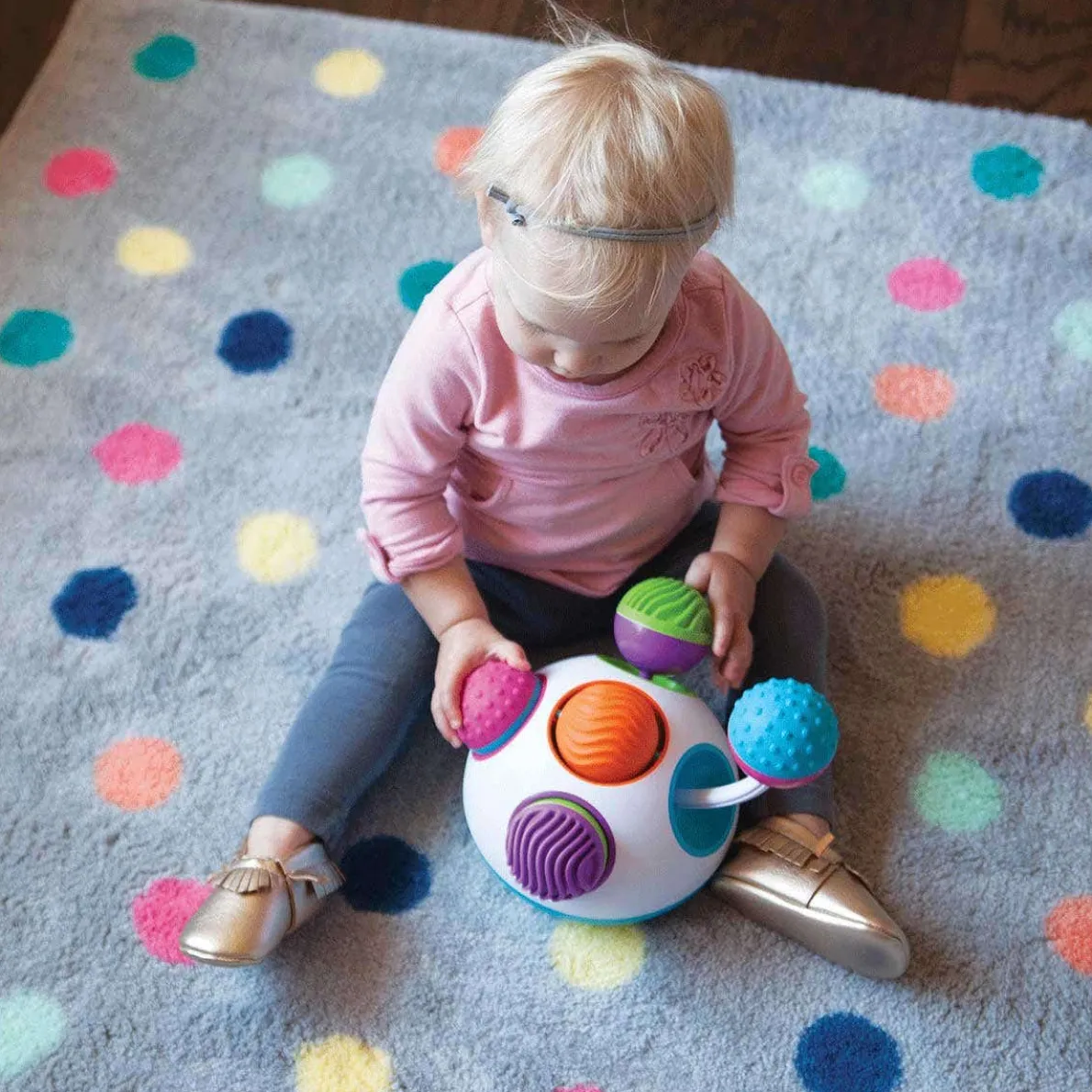 Push, spin, zip, click, and discover! Little hands will be occupied for hours once you introduce them to this unique device that’s brimming with thrilling sensory-exploration experiences. Push the pink bumpy ball in to hear a bright ratcheting sound as the blue ball on the other side is pushed out. The green and purple knobs on either side click in and out like click-pens while the bright orange and teal ball on top spins around and around. And it’s not just the sounds and movements that excite the mind. The soft-rubber tops of each ball feature unique and vivid textures that are thrilling to touch. It’s a brilliant way to truly captivate your baby’s curiosity! Give your little one an ideal avenue for early exploration with Klickity.