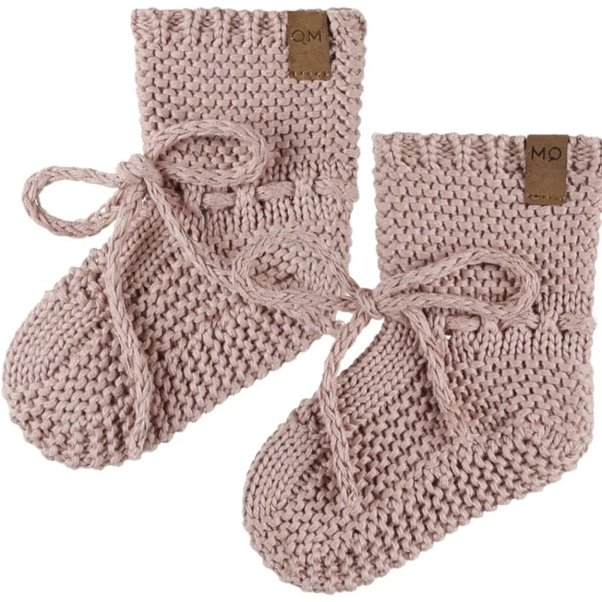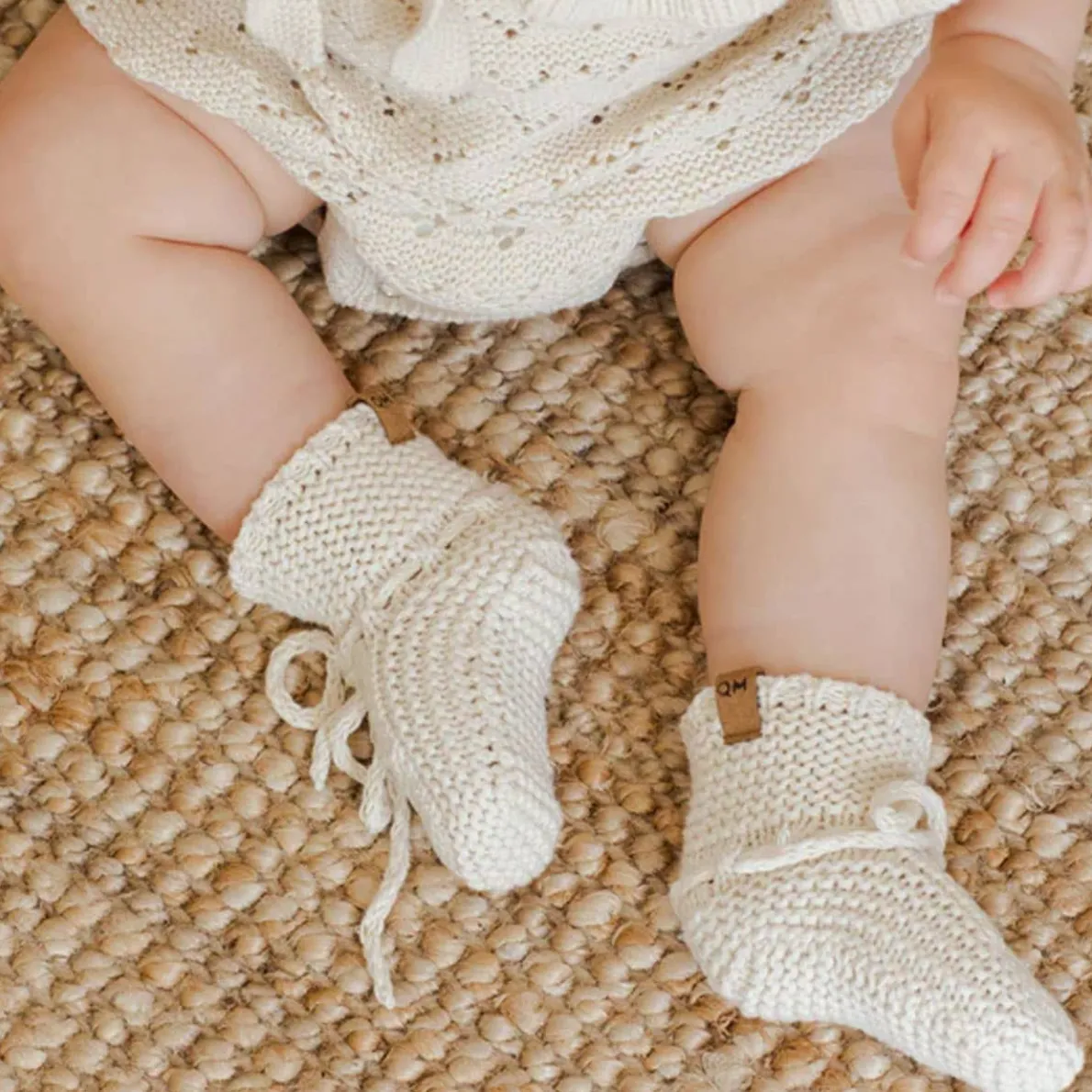 Adorable sweater knit booties with ties at the ankle for a secure fit.
