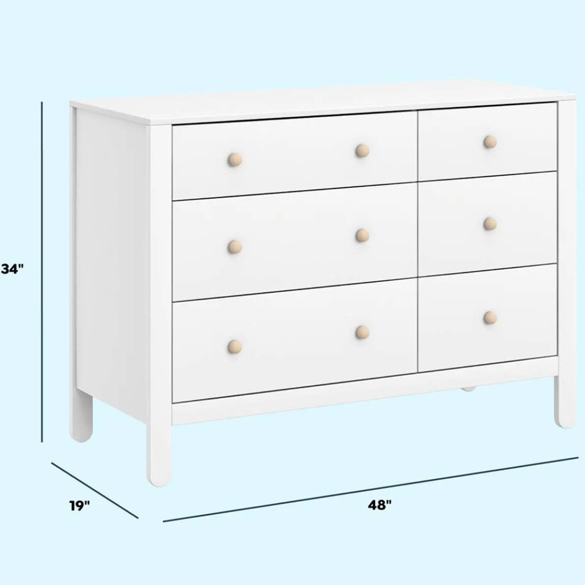 Combine playful charm and practicality with the Marisol 6-Drawer Dresser. With three large drawers for blankets and clothing and three smaller ones for everyday essentials, it features smooth ball-bearing glides for easy, quiet use. Its two-toned finish and whimsical popsicle-shaped feet add a modern yet fun touch, making it a stylish and functional piece that grows with your little one.