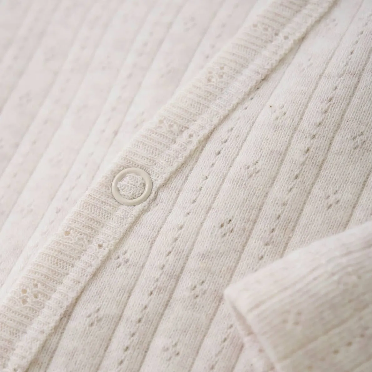 This romper is a comfortable and stylish choice for your little one. It features a long sleeve design and a ribbed texture for a cozy feel. The romper is easy to put on and take off with its snap closure.