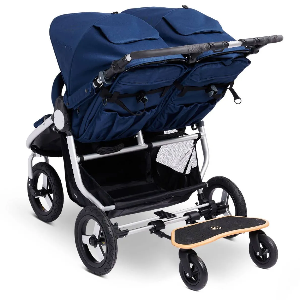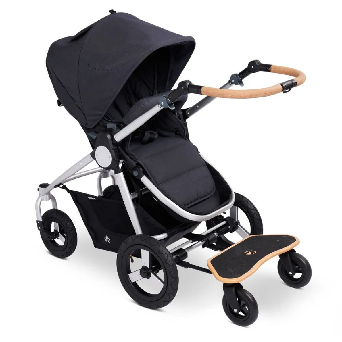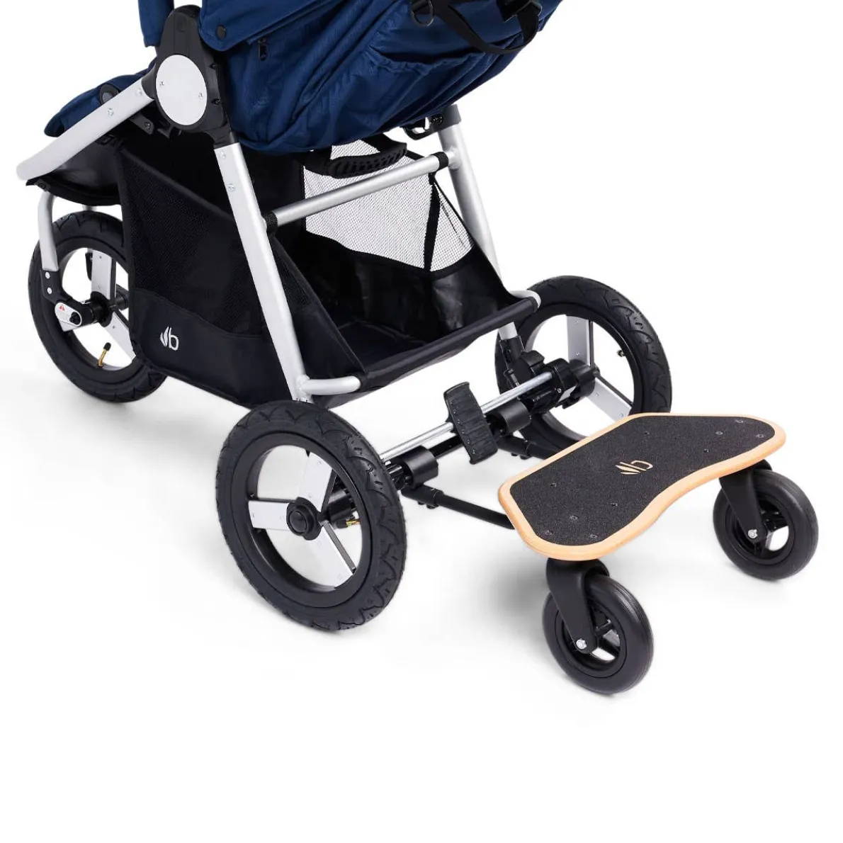 A skateboard-style toddler board with a slip resistant deck. The Mini Board easily attaches to the back of the stroller and offers a fun, “I’m a big kid” ride along experience. This new, improved version allows you to fold and stow the board when not in use with just a few snaps. The stroller is foldable with the board attached.