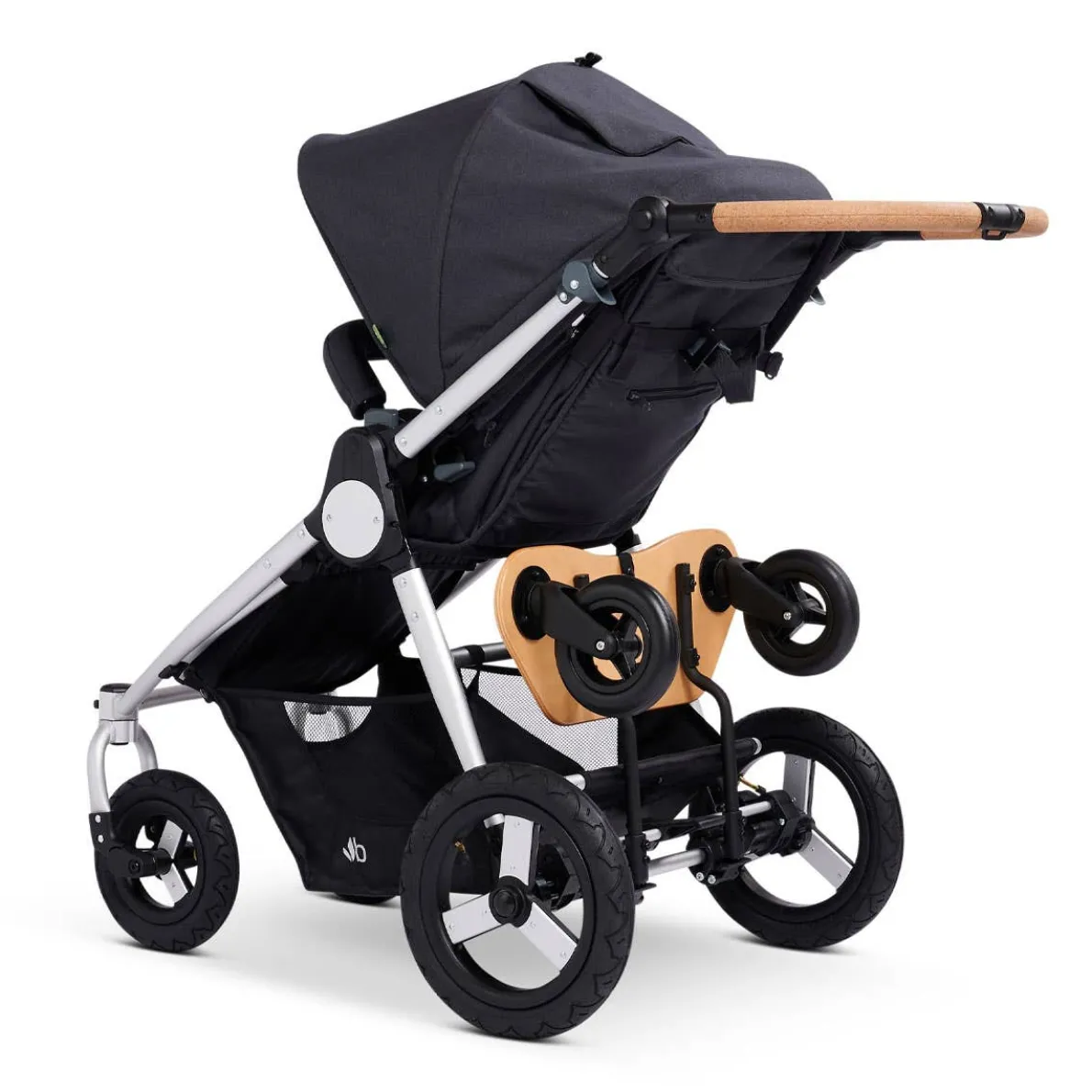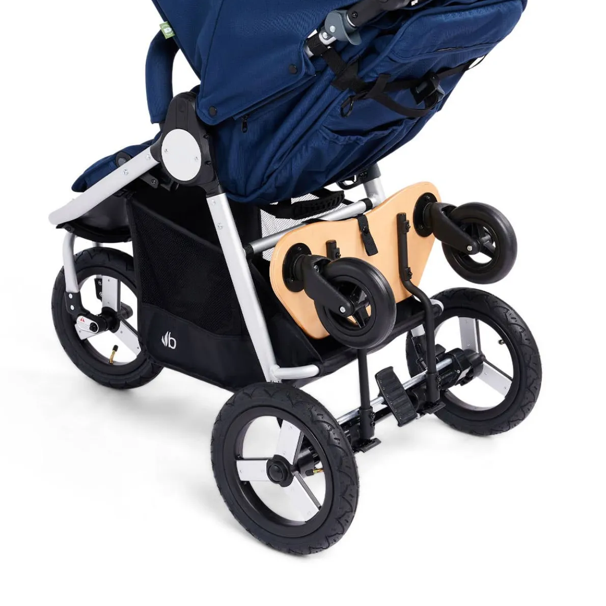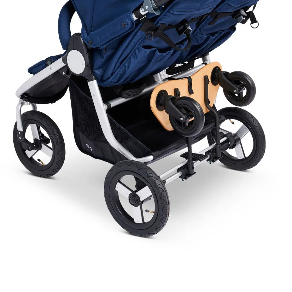 A skateboard-style toddler board with a slip resistant deck. The Mini Board easily attaches to the back of the stroller and offers a fun, “I’m a big kid” ride along experience. This new, improved version allows you to fold and stow the board when not in use with just a few snaps. The stroller is foldable with the board attached.