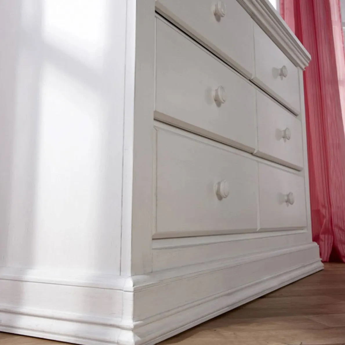 The Modena Collection has been designed to be artistically delightful as well as true to our commitment to both quality and safety. The Modena Double Dresser is crafted from sustainable wood and then finished with finishes that are regularly tested to ensure that they exceed the required standards for lead. This collection is complimented by a textured finish that is reminiscent of an antique style. It is available in Granite, a distressed gray finish, and Vintage White, a finish that is predominately white with grey highlights. Both of these finishes are lovely compliments to the traditional styling of the Modena Collection.