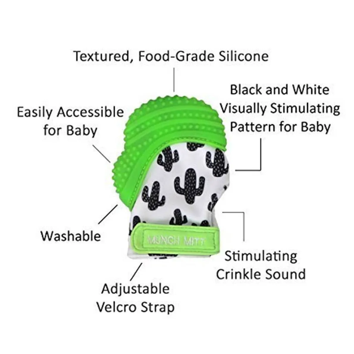 Developed by a local Burlington mama, the Munch Mitt is the world’s first silicone teething mitt. It is a wearable teething toy for infants who cannot grasp or hold a standard teether. Made with 100% food grade silicone, the munch mitt is textured for massaging gums and has a stimulating crinkle sound. An adjustable strap allows you to adjust the fit to baby’s hand.